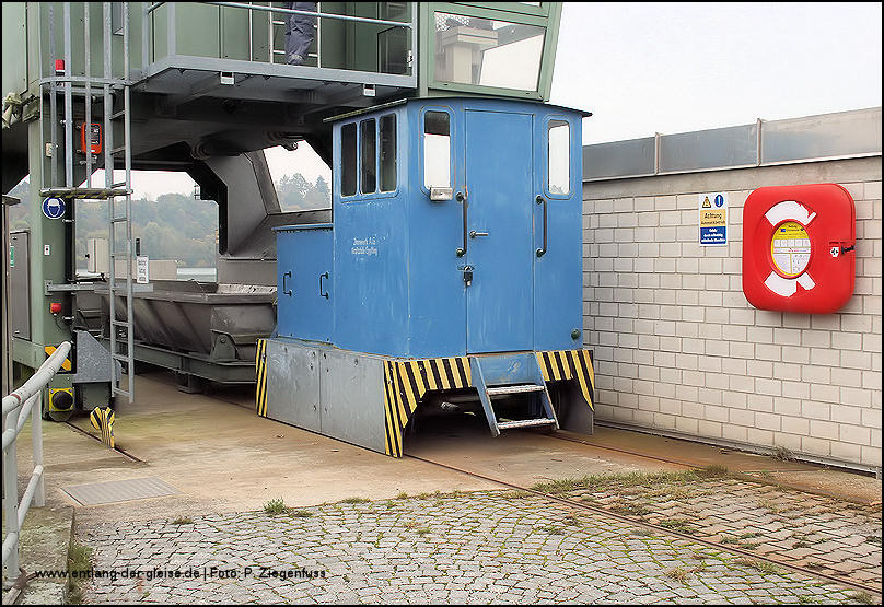 Fluss-Kilometer 35,3. Es folgen noch die Kraftwerke St. Florian und Passau, die beide ebenfalls eine Feldbahn besitzen. Die "Feldbahn" in Egglfing fährt auf 1435 mm Regelspur, da das Kraftwerk bis 1966 über ein regelspuriges Anschlussgleis mit dem Netz der Deutschen Bundesbahn in Tutting verbunden war. Eingestzt wird heute eine 1939 von Windhoff gebaute LN 18sIII mit der Fabriknummer 417. Gemeisnam mit zwei Hydraulikloren verkehrt sie auf dem etwa 300 Meter langem Gleis. Am 19.10.2010 konnte Peter Ziegenfuss die Lok unter dem Kran des Kraftwerks aufnehmen. |