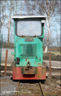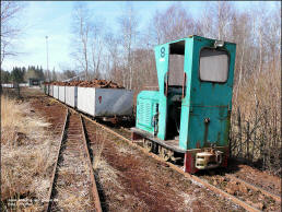 Aufgabem. 6 Ihr breites Führerhaus unterscheidet die Diema 2655, die keine Nummer trägt, von allen anderen Maschinen bei Euflor. Sie ist eine "Zugereiste", denn seit ihrer Auslieferung 1963 war sie im Torfwerk Ainring in Oberbayern aktiv. Norddetusche Moorluft schnuppert sie erst seit 2005. 7 Lok 9, hinter der sich die Diema 2746/1964 verbirgt, diente am 23.03.2011 nur als Reserve und stand auf dem Verladegleis. Hier können Feldbahnfahrzeug ohne Kraneinsatz direkt auf geeignete Lkw gefahren werden. |