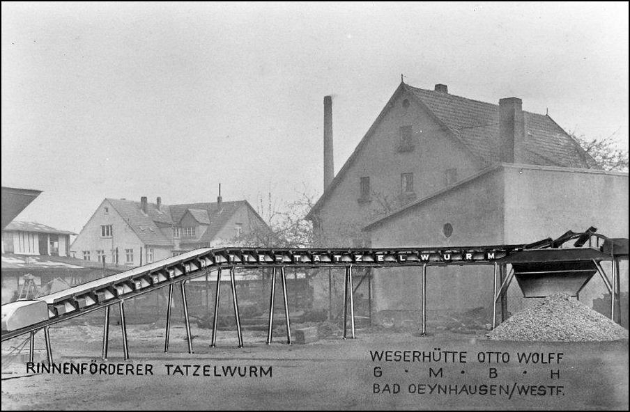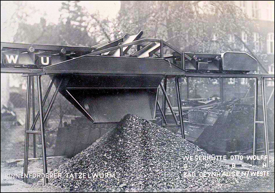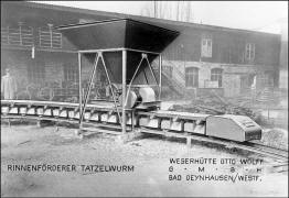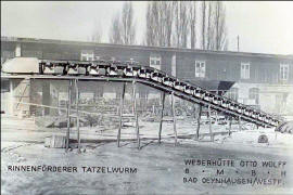 "Der Tatzelwurm stellt eine Spezialentwicklung der Weserhütte dar und besteht aus einzelnen Fördergefäßen, die beweglich aufeinander abgestützt sind und einen geschlossenen Zug bilden. Der Zug ist durch die Rückwand der Gefäße in einzelne Kammern eingeteilt. Jede Kammer oder Wagen hat zwei Laufräder. Es werden mehrere Laufräder angetrieben, die über ein Schneckengetriebe und eine Kardanwelle mit einem oder mehreren Motoren verbunden sind. Bei größeren Typen hat jede angetriebene Achse einen eigenen Motor. Im Gegensatz zum gewohnten Zugbetrieb wird je nach dem Verhältnis der getriebenen zu den lose mitlaufenden Radachsen ein Teil oder das gesamte Gewicht des Zuges einschließlich Nutzlast als Reinungsgewicht ausgenutzt. Daher ist der Tatzelwurm in der Lage, als Schienenfahrzeug starke Steigungen zu befahren, die bei längeren Steigungen, die über die Gesamtlänge des Zuges hinausgehen, bis zu 6 Grad betragen können. In Sonderfällen können auch kurze Steigungen über 6 Grad bewältigt werden. Der Tatzelwurm ist ein Fahrzeug mit den Vorteilen eines Förderbandes. Er kann das Material wir ein Plattenband kontinuierlich aufnehmen und über große Entfernungen transportieren, bei denen sich ein geschlossener Plattenbandzug nicht mehr lohnen würde. Dabei ist er kurvengängig und anpassungsfähig an das Gelände. Als Fahrbahn wird im Allgemeinen Feldbahngleis gewählt. Ein Rücken der Fahrbahn im Abbaubetrieb ist leicht möglich. Der Tatzelwurm fördert im Allgemeinen nur Schüttgüter. Der Tatzelwurm wird besonders wirtschaftlich bei kleiner bis mittlerer Leistung über mittlere bis große Entfernungen sein. Unter jedem Wagen liegt eine Sattelschurre, über die das Material seitlich vom Gleis abgeworfen wird, wenn der Wagen gekippt wird. Das Kippen geschieht durch einen Abwurfwagen, der mit Segmenten unter die Kipprollen greift, die an den Kammern seitlich befestigt sind. Der Abwurf kann ebenso wie die Materialaufgabe an jeder gewünschten Stelle erfolgen. Die Fahrgeschwindigkeit ist variabel. An den Aufgabe- und Abgabestellen fährt der Tatzelwurm langsam, während die freien Strecken mit großer Geschwindigkeit überbrückt werden. Durch elektrische, pneumatische, hydraulische oder mechanische Betätigung der Weichen, Bunkerverschlüsse, Aufgabevorrichtungen usw. kann der Gesamtbetrieb automatisch gestaltet werden. Die Zuführung der elektrischen Energie kann auf den freien Feldbahnstrecken durch 1) Schleifleisten als Oberleitung, 2) seitlich angebrachte Stromschienen, 3) Schleifkontakte im Schienensystem erfolgen. Die Strecke, in der der Abwurf erfolgt, wird auf jeden Fall mit Schleifkontakten ausgerüstet. Dadurch besteht die Möglichkeit, den Gleichstrommotoren in der Abwurfstrecke verschiedene Spannungen zuzuführen und die Fahrgeschwindigkeit der verlangten Abwurfmenge anzupassen. Der Tatzelwurm ist allen anderen Fördermitteln für die Förderung von Schüttgütern überlegen, wenn Steigungen und Kurven zu bewältigen sind. Der Großteil der vorliegenden Anfragen kommt aus der chemischen Industrie und aus Baustoff-Fabriken."