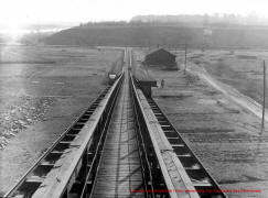 3.2 Ein beladener Tatzelwurm mit "Elektrolokomotiven" an der Spitze auf der Strecke. Rechts neben dem Zug ist die holzverkleidete Stromschiene zu erkennen, über die die Motorfahrzeuge mit Energie versorgt wurden. 3.3 Die zweigleisige Rampe mit einem mittigen Laufsteg lässt die beachtliche Steigung erkennen, die die Tatzelwürmer allein im Reibungsbetrieb bewältigen mussten.