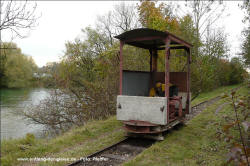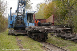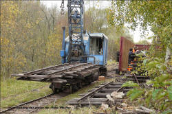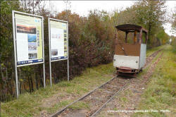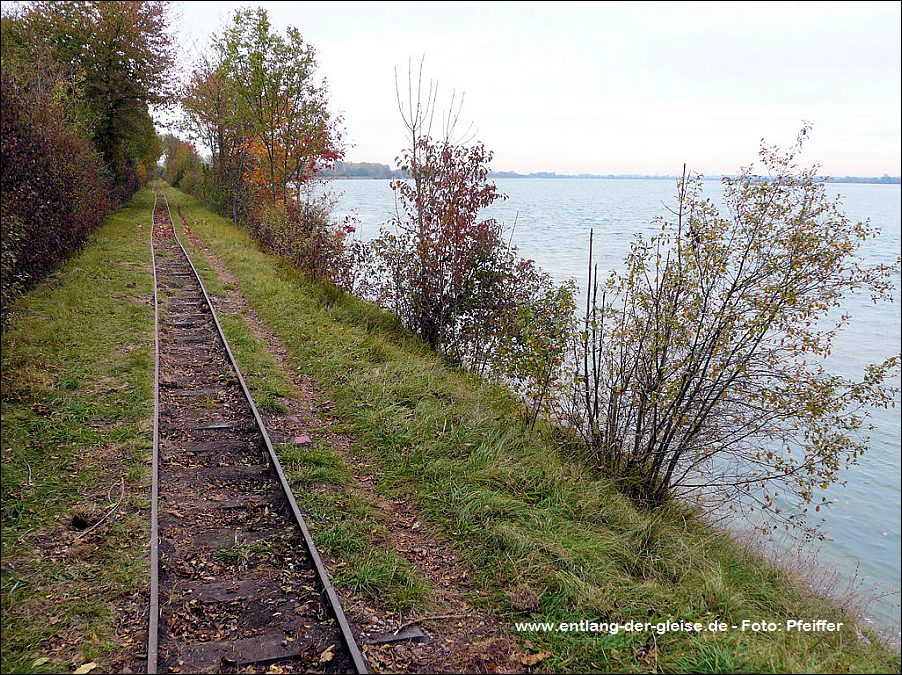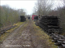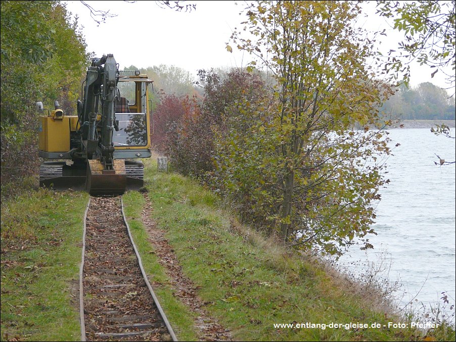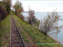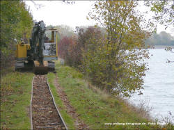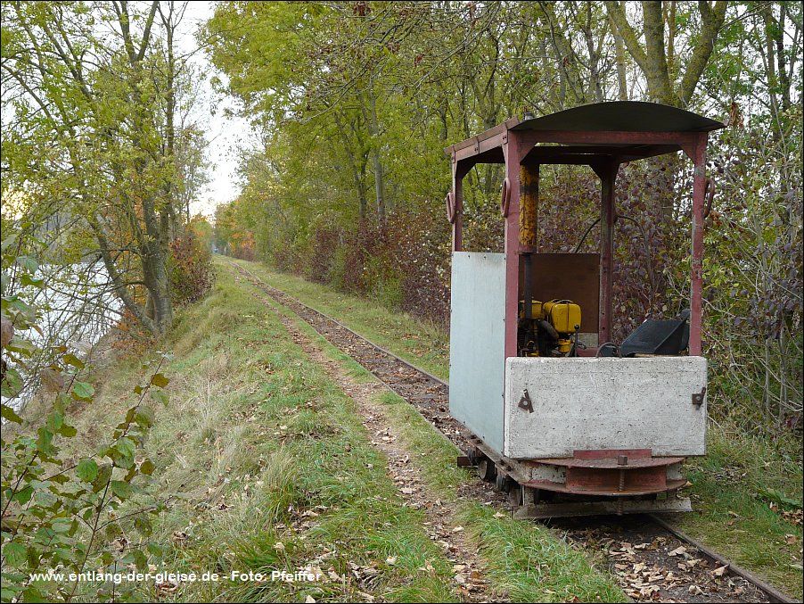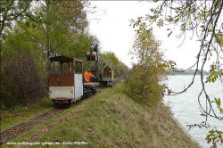 Dornröschenschlaf. Die E.ON Wasserkraft als Besitzerin des Geländes entschloss sich schließlich, alle noch vorhandenen Gleise abbauen zu lassen. Ein Unternehmen wurde beauftragt, unter Beachtng der strengen Umwelt- und Naturschutzauflagen in diesem Gebiet alles zu demnotieren. Das Projekt dauerte mehrere Jahre, da in Zeiten des Vogelzuges und der Brutphasen monatelang nicht gearbeitet werden durfte. Außerdem musste die Beschädigung der Dämme vermieden werden. Schwere Baumaschinen waren daher nicht einsetzbar. Das ausführende Unternehmen nutzte stattdessen die Feldbahn, deren Gleise zunächst befahrbar gemacht wurden, um sie dann stückweise abzubauen. Während die Gleise an den Fischteichen bereits entfernt waren, bestand im Herbst 2011 die Möglichkeit, die Arbeiten beim Abbau der früher 14 km langen nördlichen Dammbahn zu beobachten und mit der Eigenbau-Lok des Bauunternehmens auf dem verbliebenen 1200 m Gleis zu fahren. Dabei entstanden am 25.Oktober 2011 diese Aufnahmen. Drei Tage später war auch dieses letzte Gleisstück im Teichgut Geschichte. Hinweis: Alle Aufnahmen können durch Anklicken vergrößert werden. |