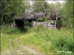 museumsgerechte Aufstellung. 9 Über diese Sturzbühne wurde der Torf im Haidgauer Werk früher auf darunter stehende Lkw umgeladen. Mittlerweile fährt die Museums-Feldbahn unter der Bühne hindurch. 10 Nicht historisch ist diese Brücke, mit der die neu gebaute Museums-Feldbahn zwischen den beiden ehemaligen Torfwerken den Achkanal überquert. |