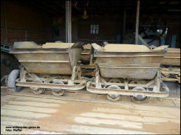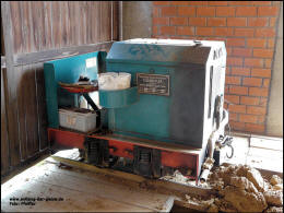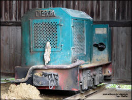 Muldenbauarten deutlich erkennbar. 3 In Wartestellung ist die Diema 2320 von 1960, eine 8 PS starke Lok vom Typ DL 6. 4 Ob diese Lore ihre Mulde durch einen unachtsamen Radlader-Fahrer verloren hat? Jedenfalls wird der Ton nicht immer zielgenau im Bunker platziert. |