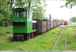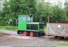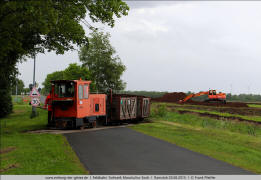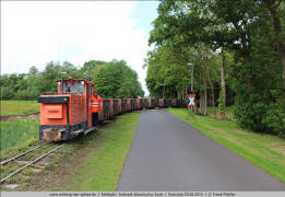 Das geht mit der nötigen Erfahrung ohne jedes Manövrieren. 2.8 Entlang der Moorgutsstraße nähert sich ein weiterer beladener Zug. Es führt die grüne Lok 25 (Schöma 4718/1983) vom Typ CHL-30G, die erst 2013 vom Ruhrbergbau übernommen worden und gründlich aufgearbeitet worden war. 2.9 insgesamt vier dieser Loks waren aus dem Ruhrgebiet übernommen worden. Sie erhielten alle unterschiedliche Lackierungen: grün, gelb, silber und orange. |