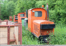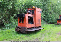 angerostet. 3.8 Schöma 4759/1985 mit der Nummer "32" ist eine der vier Loks, die man 2013 aus dem Ruhrkohle-Bergbau übernommen und gründlich aufgearbeitet hat. Sie sind alle in unterschiedlichen Farben lackiert. 3.9 Einzige Lok ohne Wetterschutz für den Fahrer ist die Diema 1582/1953, eine Lok vom Typ DS 16, die hier die Betriebsnummer "U4" trägt. |