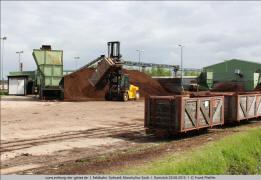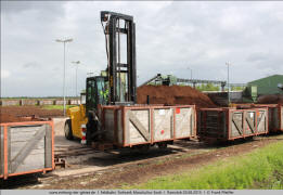 1.20 1.21 1.22 Am Torfwerk werden die Wagen per Gabelstapler aufgenommen und über dem Entladetrichter um 360 Grad gedreht. Den Rest erledigt die Schwerkraft. |