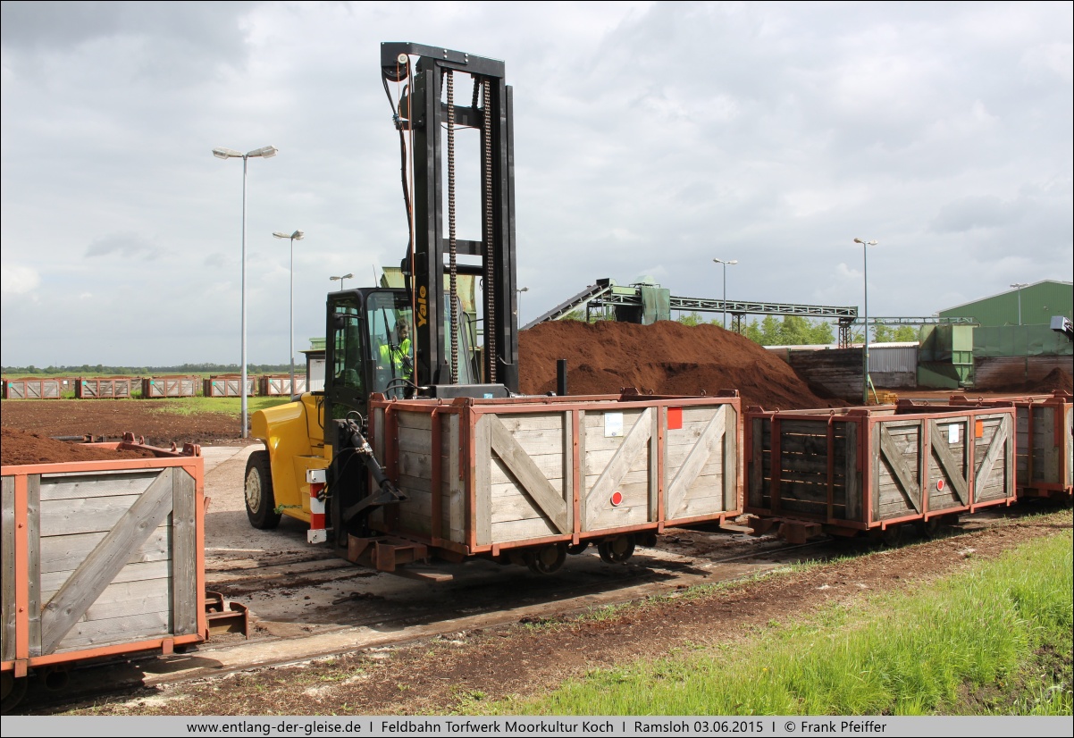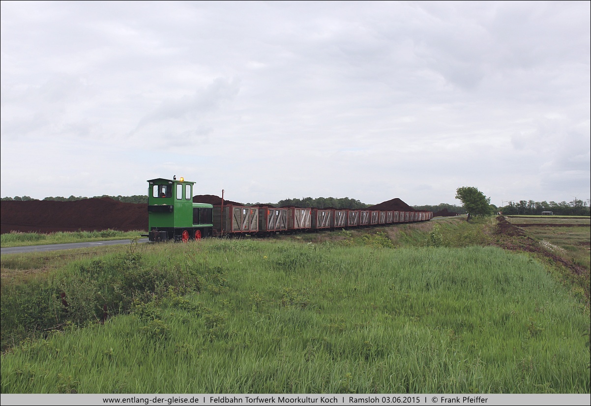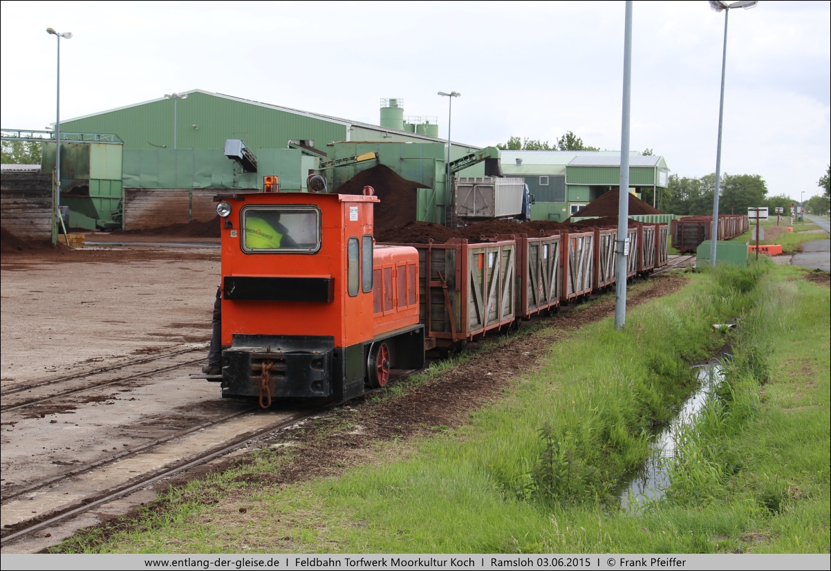 Westermoor. Das Moorgut Ramsloh am Verbindungsweg Ramsloh - Burlage wurde zwischen 1906 und 1918 errichtet. Entlang des Weges gab es bereits ein Feldbahngleis für landwirtschaftliche Zwecke, das nun auch vom Moorgut mitgenutzt wurde. 1927 wurde am Bahnhof Ramsloh ein Torfwerk errichtet, welches ebenfalls an die Feldbahn angeschlossen war. Das Werk und die Abbauflächen gehörten zu dieser Zeit der Oldenburgischen Moorgutgesellschaft (OMG). 1941 kaufte die Firma Friedrich Krupp den Betrieb, da man die Flächen als Zielaufschlagplatz für den etwa 50 Kilometer entfernten Schießplatz Meppen benötigte. 1942 hatte das Gelände eine Ausdehnung von rund 880 Hektar. 1957 erwarb die Bundesrepublik Deutschland den Betrieb von Krupp, erweiterte ihn um rund 250 Hektar Staatsflächen in der Esterweger Dose und führte ihn weiter. 1959 wurde der Betrieb mit dem Moorgut an den bisherigen Geschäftsführer Werner Koch verpachtet. Der Staat behielt sich allerdings vor, Flächen ohne Aufrechnung in Anspruch zu nehmen, was zwischen 1975 und 1979 auch geschah: Für den Bau des sogenannten Längswellensenders Ramsloh der Bundesmarine, der 1980/81 seinen Betrieb aufnahm, wurden 500 Hektar benötigt. Für die Firma Werner Koch war das der Verlust eines Großteils der Abbauflächen, der in den Folgejahren nur teilweise durch den Zukauf vormals landwirtschaftlich genutzter Flächen und die Übernahme anderer Torfbetriebe (1980: Börgermoor GmbH, 1989: Union-Torfwerk Sedelsberg) ausgeglichen werden konnte. 1994 wurde neben dem Moorgut ein neues Torfwerk mit Lkw-Verladeanlage in Betrieb genommen und die alte Strecke entlang der Moorgutstraße zum Bahnhof Sedelsberg stillgelegt. 1999 konnte Koch die Gebäude und Wege sowie einen Teil der Abbauflächen von der Bundesrepublik kaufen. Mit den nun noch zur Verfügung stehenden Flächen kann das Unternehmen bis etwa 2035 arbeiten, wenn keine Gesetzesvorhaben den Torfabbau weiter einschränken. Das Feldbahnnetz mit 600 mm Spurweite gliedert sich in zwei Äste: Ein Ast im alten Abbaugelände führt parallel zur Sendestation und bis in Sichtweite der 900 mm Torfbahn, die Griendstveen vom Küstenkanal aus betreibt. Der zweite Ast verbindet das Abbaugebiet des übernommenen Union-Torfwerks mit dem Stammwerk. Dabei wir ein Teil der Gleise auch vom Torfwerk Brinkmann mitbenutzt. Das Union-Torfwerk existiert nicht mehr, doch im Abbaugebiet wurde in der Nähe des Eulenweges eine neue Verladeanlage gebaut. Am 03.12.2014 wurde letztmals Torf aus dem alten Abbaugebiet gefahren, die Flächen werden anschließend der Renaturierung zugeführt. Das vorhandene Streckengleis in diesem Bereich soll für touristische Fahrten allerdings erhalten bleiben. Hinweis: Die Bilder können für eine vergrößerte Darstellung angeklickt werden. |