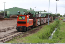 CHL-40G) mit einem Leerzug von dort zurück. 2.2 Die Kreuzung mit der Moorgutsstraße ist ampelgesichert. Der Zug macht sich auf den Weg zurück zu den Abbauflächen. 2.3 Und so sieht es hinter dem Werk aus. Von hier ist der Leerzug gerade gekommen. Zwei beladene Züge warten noch auf Entladung. |