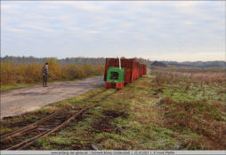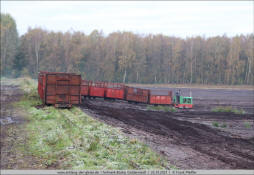 Morgen hinter dem Bauzug aus dem Werk ins Moor fährt. 1.21 Die Streckenlok wurde abgekuppelt und fährt in ein Nebengleis. |