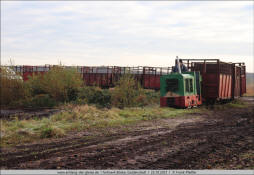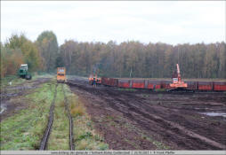 dem Hauptgleis beiseite. 2.8 Derweil fährt sich der Baggerfahrer schon mal warm. 2.9 Nachdem die größeren Loks aus dem Weg waren, hat sich die kleine Maschine vor den Leerzug gesetzt und wird gleich zum Bagger tuckern. |