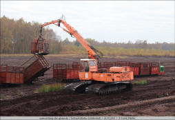 1.28 Die vor längerer Zeit zum Trocknen gestapelten Torfsoden werden vom Bagger in die Loren geladen. Gut erkennbar ist das Gefälle zum tief liegenden Abbaufeld, das den kleinen Loks einiges abverlangt, um beladene Züge wieder auf den Damm zu bringen. Gut zu erkennen ist auch, wie weich der Boden ist, denn der Torfbagger hat einige Mühe, sich trotz breiter Ketten und großer Standfläche fort zu bewegen. |