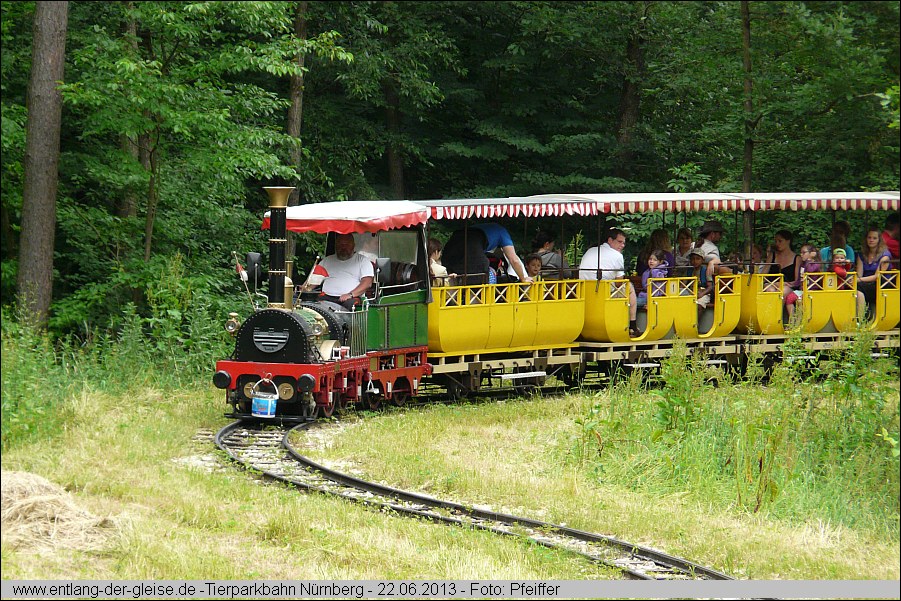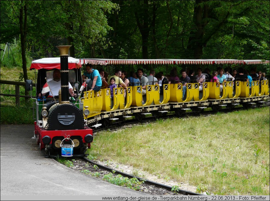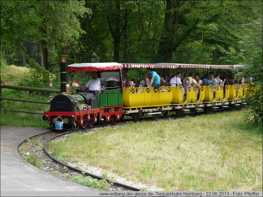 ![]() Am 5.5.1964 wurde die neue Kleinbahn eröffnet, die den Namen "Kleiner Adler" erhielt und deren Zug dem namensgebenden Original nachempfunden war. Initiator für den Bau des "Kleinen Adler" war der Verein der Tiergartenfreunde Nürnberg e.V., der die Bahn dem Tiergarten stiftete. Diese Bahn vekehrt auf 600 mm Spurweite. Die Lokomotive weist einen dieselhydraulischen Antrieb mit beachtlichen 92 PS Leistung auf. Für den Bau der Strecke mussten damals 280.000 DM aufgebracht werden, weitere 85.000 DM kostete der Zug. Lok und Wagen wurden maßgeblich von der Lehrlingswerkstatt der Firma MAN in Nürnberg gebaut, finanzielle Unterstützung kam auch von den Siemens-Schuckert-Werken und dem Modelleisenbahnhersteller Trix. Bei der 2011/2012 erfolgten Überholung des Zuges war die Ausbildungswerkstatt der MAN Truck & Bus AG in Nürnberg maßgeblich beteiligt. Am 14.09.2009 war die Kleinbahn eingestellt worden, weil ihre Trasse durch den Bau der neuen Delphinlagune unterbrochen wurde. Nach drei Jahren Zwangspause konnte sie auf einer neuen Trasse am 31. März 2012 den Betrieb wieder aufnehmen. Die geänderte Trassenführung konnte auch dank der großzügigen Förderung von SpardaBank, Deutscher Bahn AG und Lions Club Nürnberg umgesetzt werden. Befahren wird nun eine rund 700 Meter lange Strecke mit zwei Wendeschleifen am Haupteingang und am Streichelzoo. Abgestellt wird der Zug bei Nichtgebrauch in einem Holzschuppen, der "auf freier Strecke" über das Gleis gebaut wurde. Hinweis: Sämtliche Aufnahmen entstanden am 22.06.2013. |
