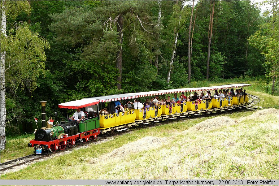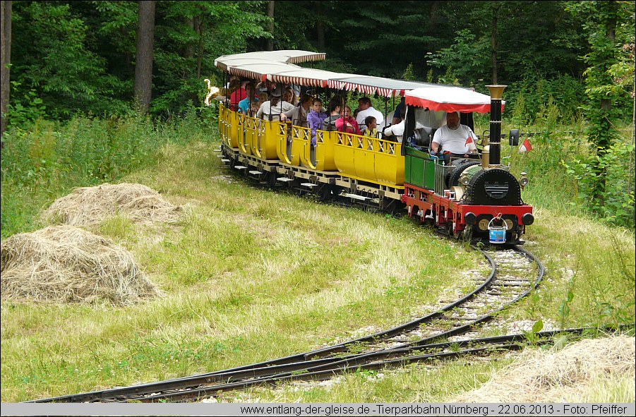 Durchaus einer Feldbahn gleich schlängelt sich der Zug durch den Nürnberger Tierpark. |