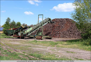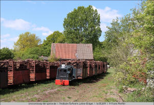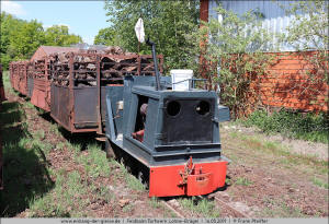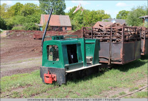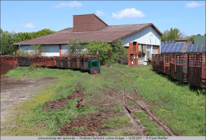 | An diesem Besuchstag dreht sich ebenfalls kein Rad, doch beladene Züge und teilweise blanke Gleise erwecken den Eindruck, dass zumindest im Werk noch gefahren wird. Den meisten Loks hat man einen neuen Anstrich spendiert, aber das gesamte Gelände lässt erkennen, dass der Feldbahnbetrieb in den letzten Zügen liegt. |