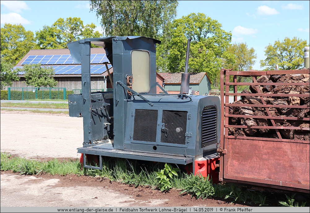 vor einem verbliebenen Altbau im Torfwerk steht. 2.2 In der Einfahrgruppe wartet in der Morgensonne noch ein beladener Zug auf Entladung. Die im Werk als Rangierlok eingesetzte Schöma 1703 hat sich bereits vor den Zug gesetzt. 2.3 Auf einem Nebengleis wartet eine lange Reihe leerer Torfloren auf weitere Einsätze. Die kleine Schöma 2658 wird ebenfalls nicht benötigt. |