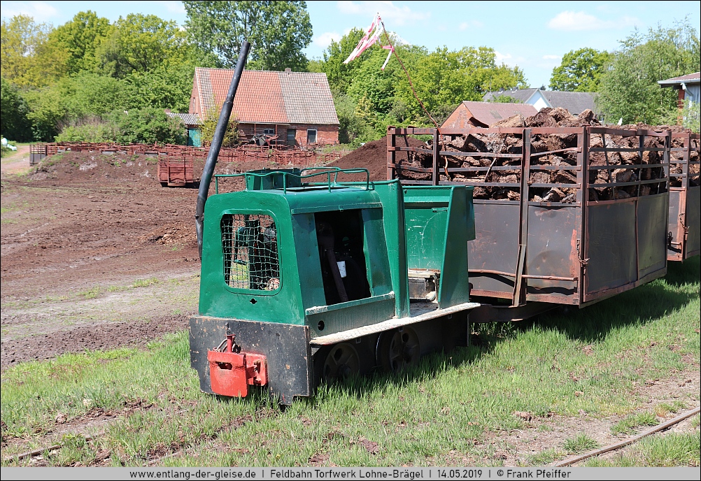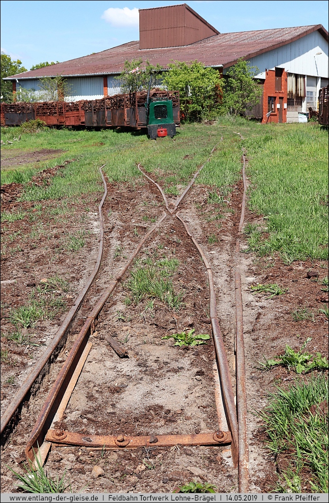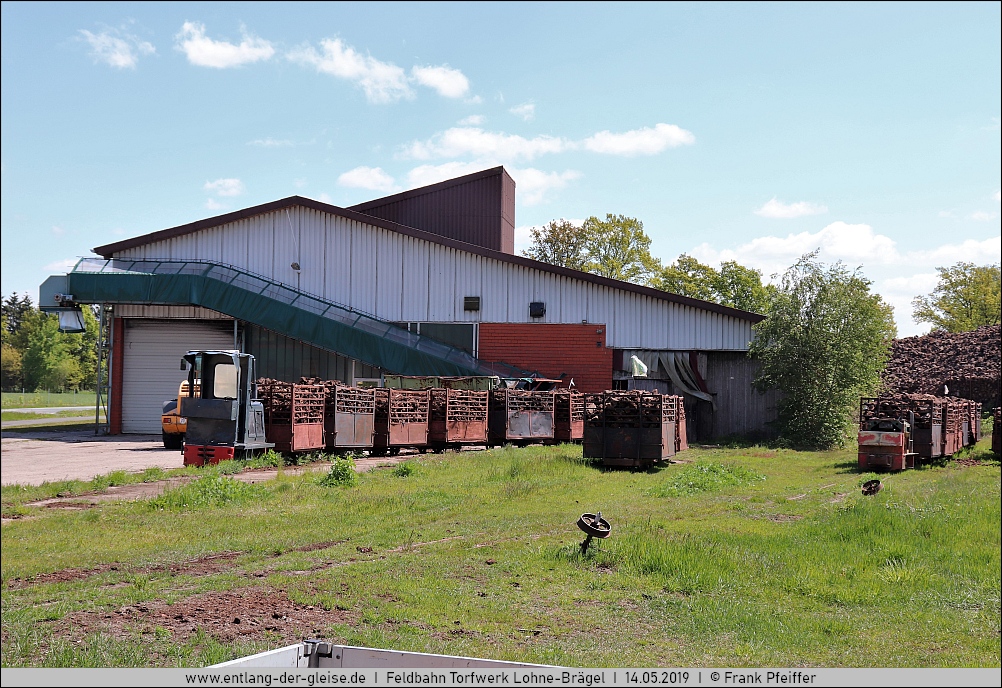 werden konnten. Seit ca. 2019 wird der Torf nicht mehr mit der Feldbahn aus dem Moor gebracht. Stattdessen bringen Lkw Torf von anderen Abbaustellen, der auf dem Hof des Werkes abgeladen und mit einem Radlader in die Loren gekippt wird. Die beladenen Loren werden dann wenige Meter ins Gebäude geschoben und dort wieder entladen; nur auf diesem Weg ist die Verpackung des Torfs möglich. |