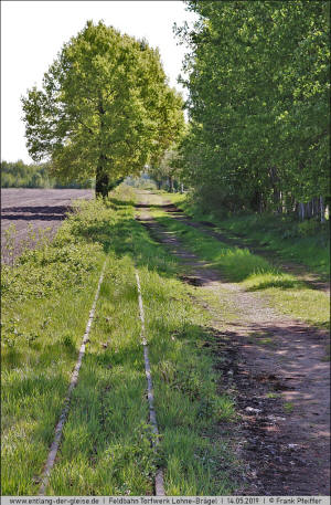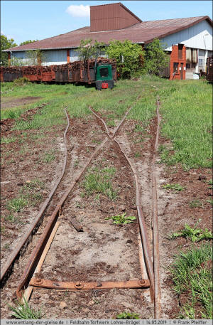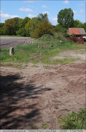 Torfflächen zu erreichen. 1.12 Hinter der Diema 1720/1954 endet das Gleis im Werk. Möglicherweise führte von hier aus eine weitere Strecke ins Lohner Moor. 1.13 Im hohen Gras findet sich noch eine Auflege-Drehscheibe, mit der einzelne Loren rechtwinklig vom Hauptgleis in ein Nebengleis wechseln konnten. |