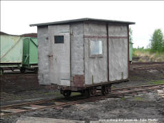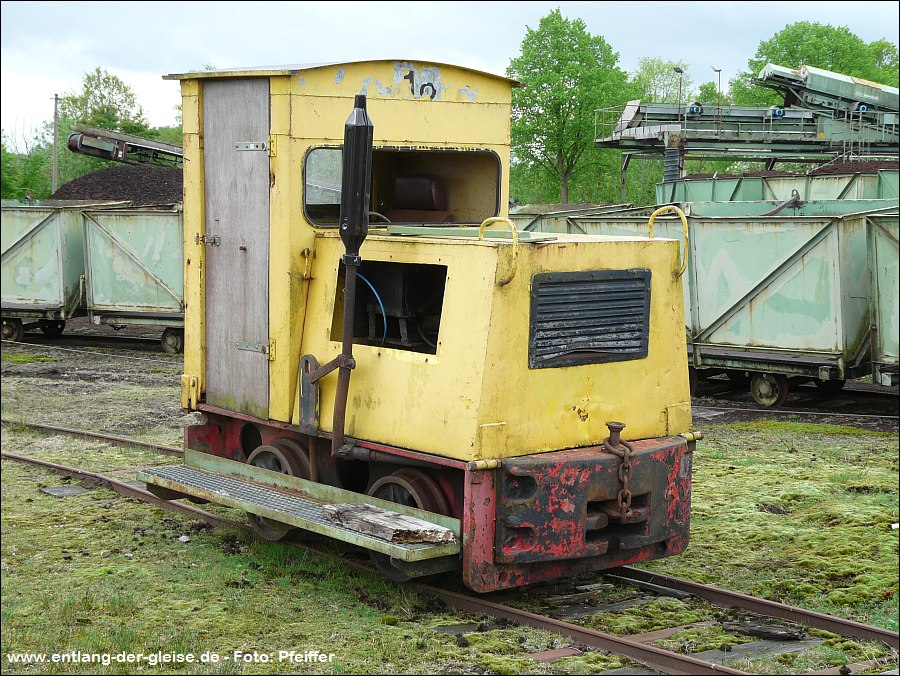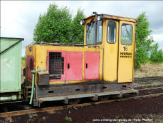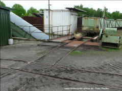 bekam sie ein Führerhaus Marke Eigenbau. 3 Mit Trittbrett, neuer klappbarer Motorhaube und einem Führerhaus, das sicherlich nicht ab Werk geliefert wurde, zeigt sich Lok 18 im Werk. Ihre Identität in Form eines Fabrikschildes hat sie leider verloren. 4 An einem der beiden Entladegleise verhindert Lok 5 (Schöma 3229/1970) als mobiler Prellbock, dass entladene Wagen über das Gleisende hinaus rollen können. |