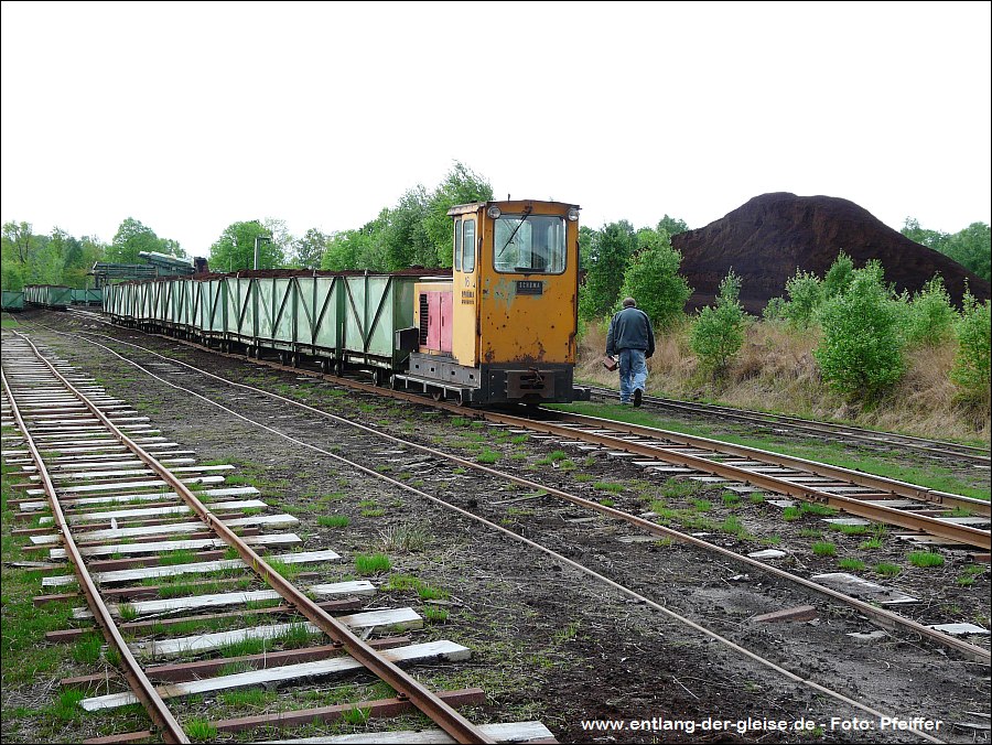 | 1 Sieht nur so aus, wie ein normaler Torfzug: Lok 5 verhindert am Ende eines Stumpfgleises lediglich, dass die entladenen Torfloren zu weit rollen. |