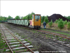 mit einer Funkfernsteuerung ausgestattet. 6 Die Esterweger Dose mit dem Westermoor liegt hinter dem beladenen Zug, der gleich die Entladestelle erreichen wird. 7 Vor der Entladung liegen gleich vier Gleise parallel - man beachte den unterschiedlichen Zustand jedes Gleises! Lok 16 hat ihren Zug umfahren und schiebt ihn nun die letzten Meter zur Entladung. |