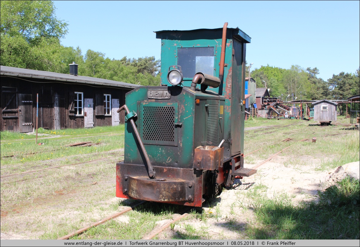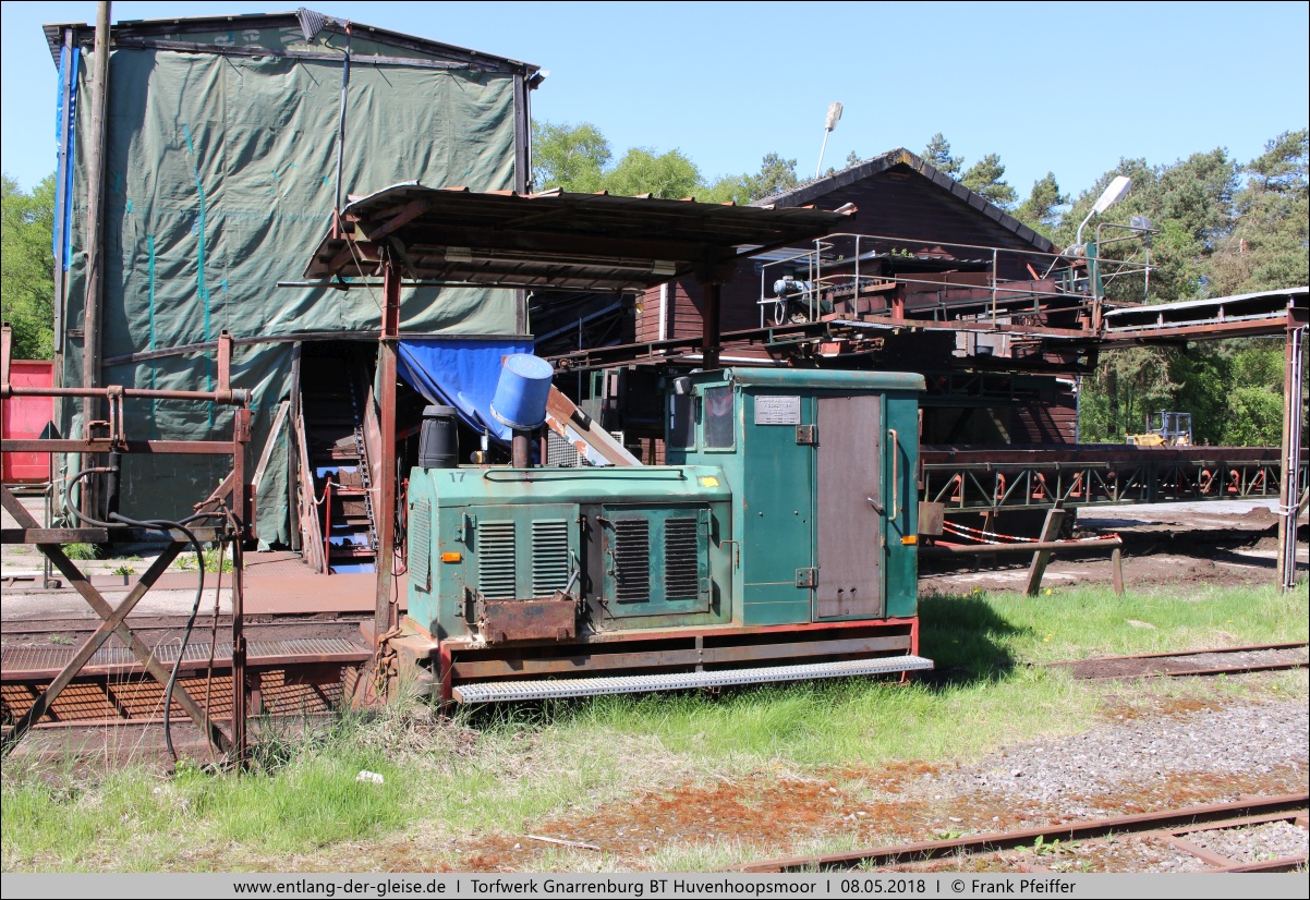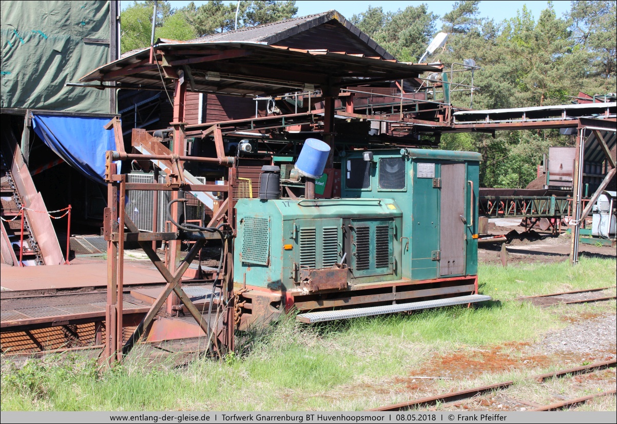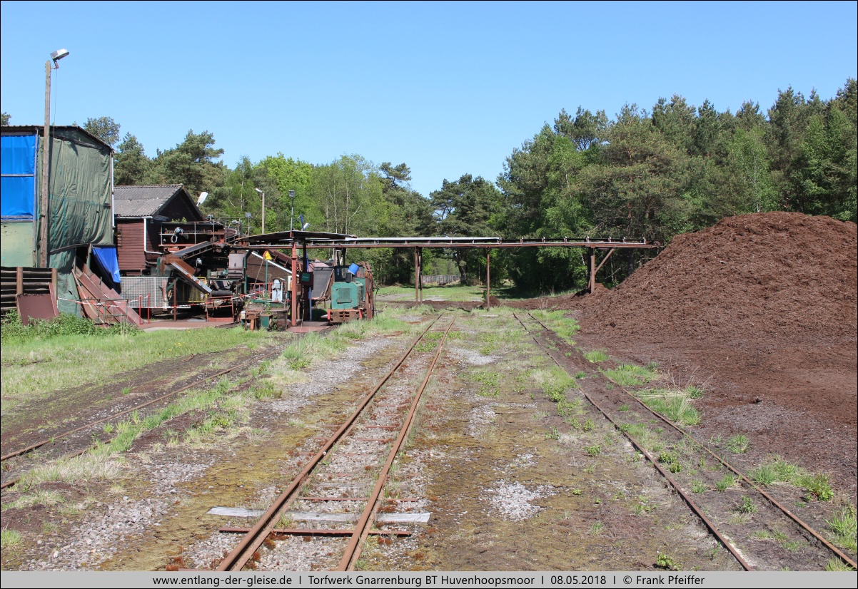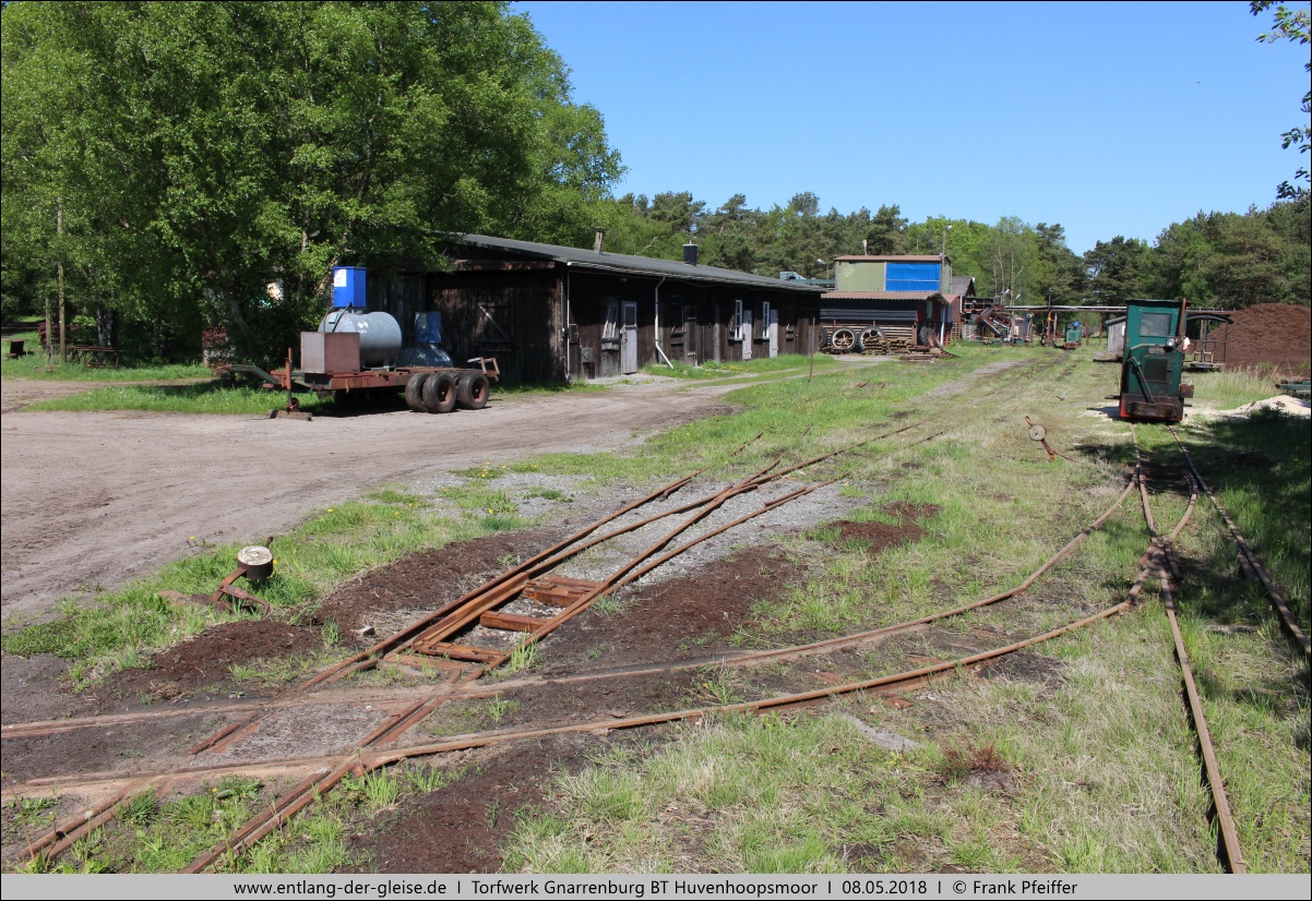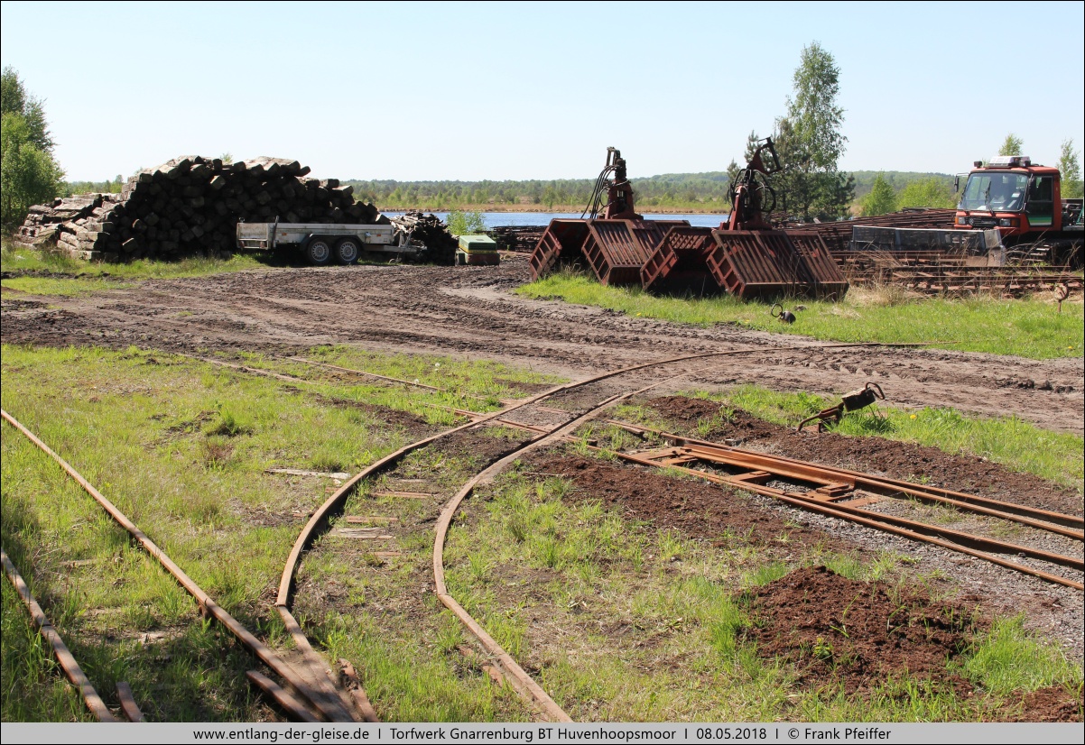| 2018 ist der Torfabbau im Huvenhoopsmoor so gut wie eingestellt. Der früher mit dem Stammwerk in Gnarrenburg über eine längere Strecke verbundene Standort wirkt verschlafen, doch es stehen noch einige Loks herum und die Gleise weisen Ansätze von Fahrspuren auf. Vermutlich finden im Moor Renaturierungs- und Rückbaumaßnahmen statt, für die man die Bahn noch nutzt. |