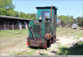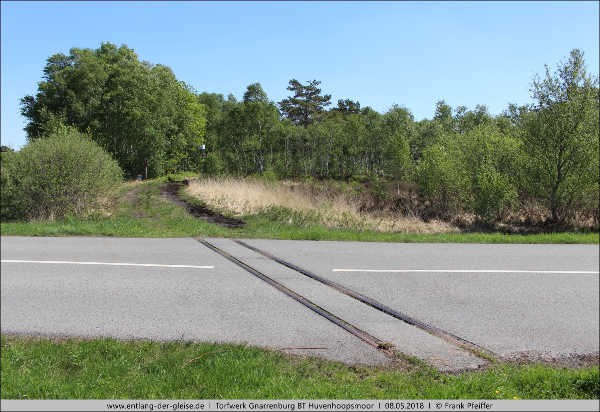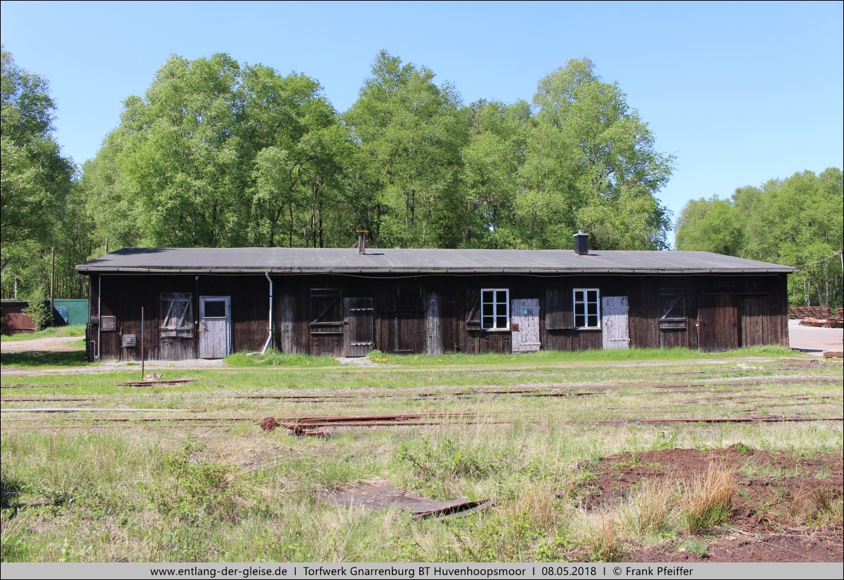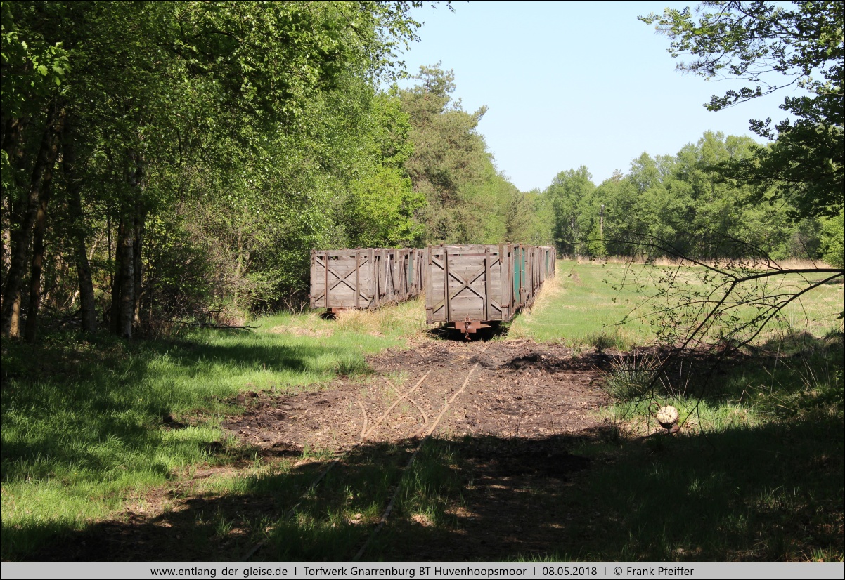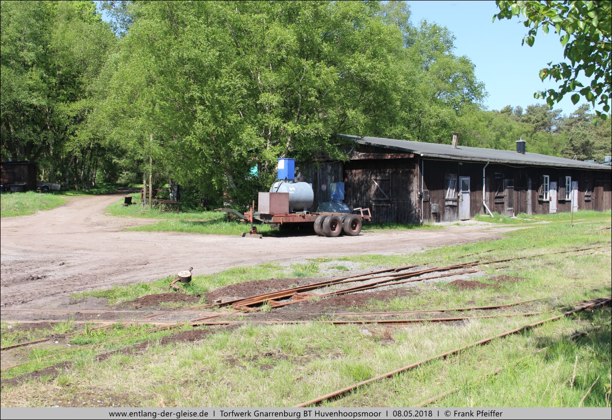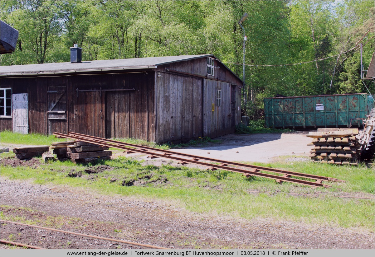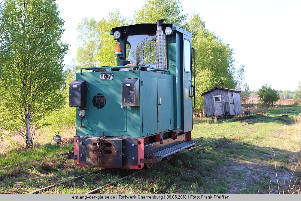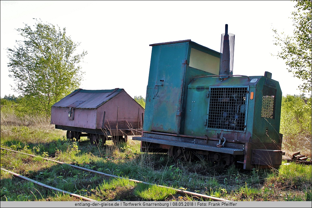 | 2018 ist der Torfabbau im Huvenhoopsmoor so gut wie eingestellt. Der früher mit dem Stammwerk in Gnarrenburg über eine längere Strecke verbundene Standort wirkt verschlafen, doch es stehen noch einige Loks herum und die Gleise weisen Ansätze von Fahrspuren auf. Vermutlich finden im Moor Renaturierungs- und Rückbaumaßnahmen statt, für die man die Bahn noch nutzt. |