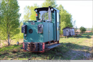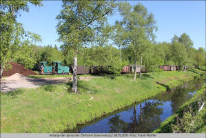 mit einem beladenen Zug unterwegs ins Werk. 2.2 Der Zug hat die Werkseinfahrt erreicht und wird gleich an die Rangierlok übergeben werden, die die Loren durch die Entladung führt. Der 1790 fertiggestellte Oste-Hamme-Kanal diente der Entwässerung der Moore und dem Transport von Brenntorf in sogenannten Halbhunt-Kähnen, die getreidelt wurden. 2.3 Unmittelbar vor der Entladeanlage am Werk übergeben die Streckenloks ihre Züge an die hier eingesetzte Rangierlok, ebenfalls eine Schöma CHL 20 G. Das weitere Geschehen spielt sich dann nicht sichtbar hinter Sichtschutzzäunen ab. |