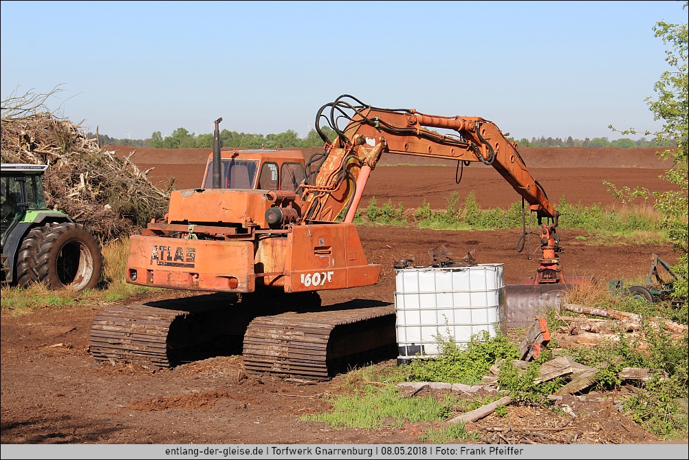 zu Mieten aufgehäuft werden kann. 2.11 Dieser Atlas 1602 E Bagger ist wohl nur noch Reserve, denn er ist schon um die 35 Jahre alt. 2.12 Ein Blick auf eines der Stichgleise, entlang derer der Torf aufgehäuft wird. Rechts schon aussortiertes Totholz, das nicht mit dem Torf vermischt werden darf. |