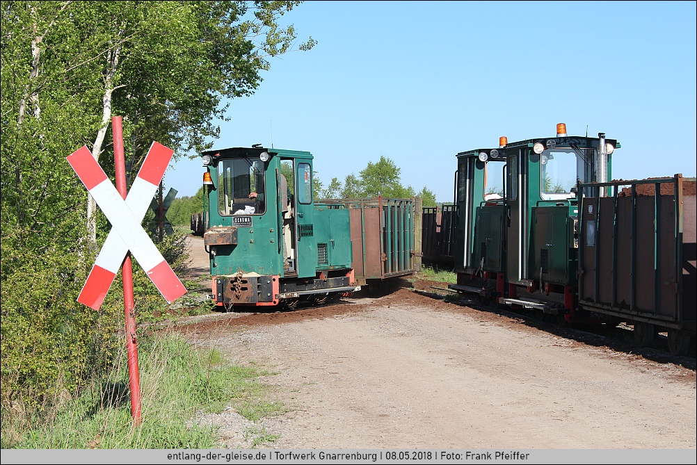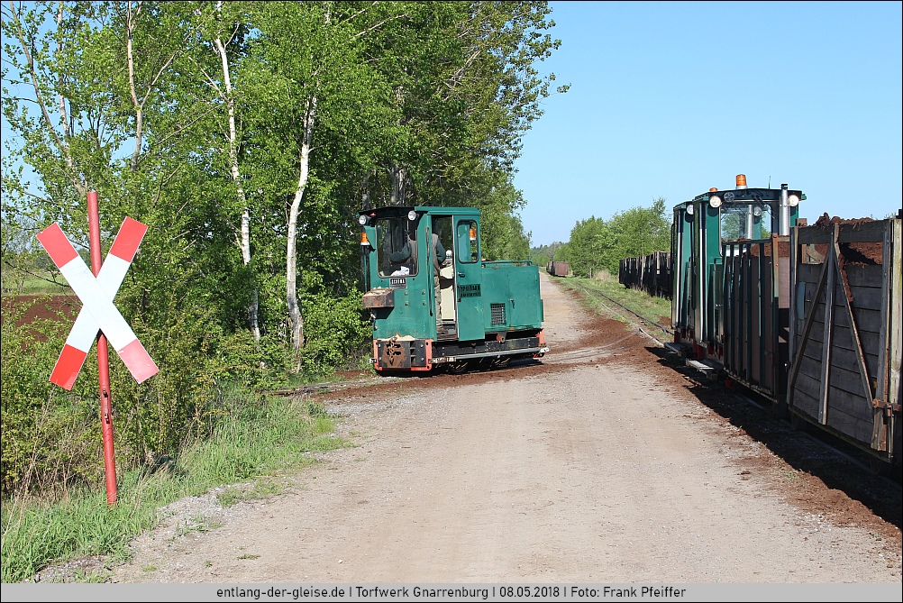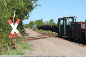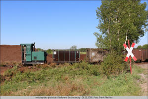 dabei rund 2,5 km zurück legen. 2.5 Im Abbaugebiet lassen die beiden Loks ihren Leerzug stehen und holen den beladenen Gegenzug aus dem Torffeld. Die Moorlok - hinten noch zu erkennen - folgt nach. 2.6 Hier sind am Försterkanal sogar Andreaskreuze aufgestellt! Der beladene Zug wurde eben über den Weg gezogen und nach rechts zurück geschoben. Frei Bahn für die Moorlok. |