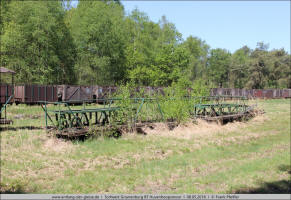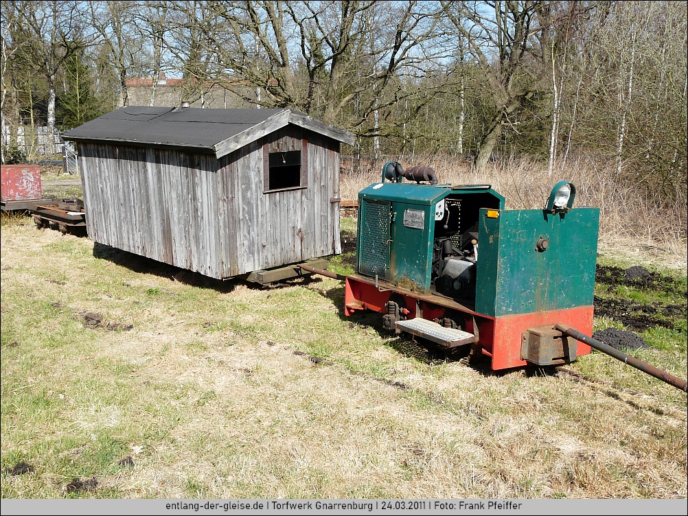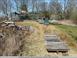 | An diesem Tag konnte ein kurzer Blick auf die isoliert vom übrigen Feldbahnnetz betriebene Bahn an der Abbaustelle Klenkendorf geworfen werden, die unscheinbar zwischen Wohnhäusern lag und zum Besuchszeitpunkt auch nicht genutzt wurde. Wenig später ist der Bahnbetrieb hier vollkommen eingestellt worden und der Torf wurde mit Treckergespannen auf einem anderen Weg zur Hauptstraße und weiter zum Gnarrenburger Werk abgefahren. |