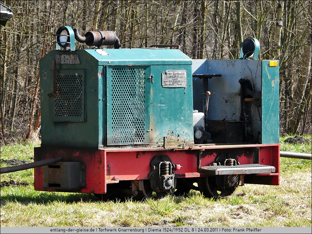 Förderband fehlt bereits. 1.2 Neben den beiden Plattformloren waren nur noch die fahrbare Aufenthaltsbude und eine Diema DL 8 hier zu finden. 1.3 Die Diema 1524/1952 ist eine DL 8 und fand nach Einstellung des Bahnbetriebs in Klenkendorf andere Aufgaben im Torfwerk Gnarrenburg. |