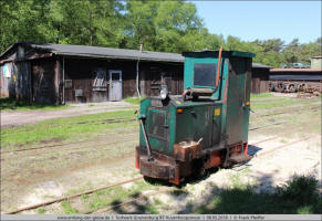 Aufenthaltsbude für die Arbeiter im Moor. 2.14 Wenigstens eine alte Lok konnte angetroffen werden: Lok 18, die Diema 1457/1951 vom Typ DS 12, steht mit einem Gerätewagen auf einem Nebengleis im Moor. Das vordere Gleis führte früher viele Kilometer weiter zum Betriebsteil Huvenhoopsmoor. |