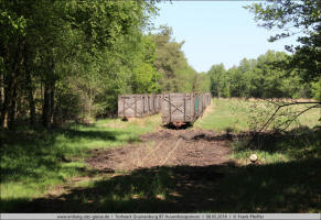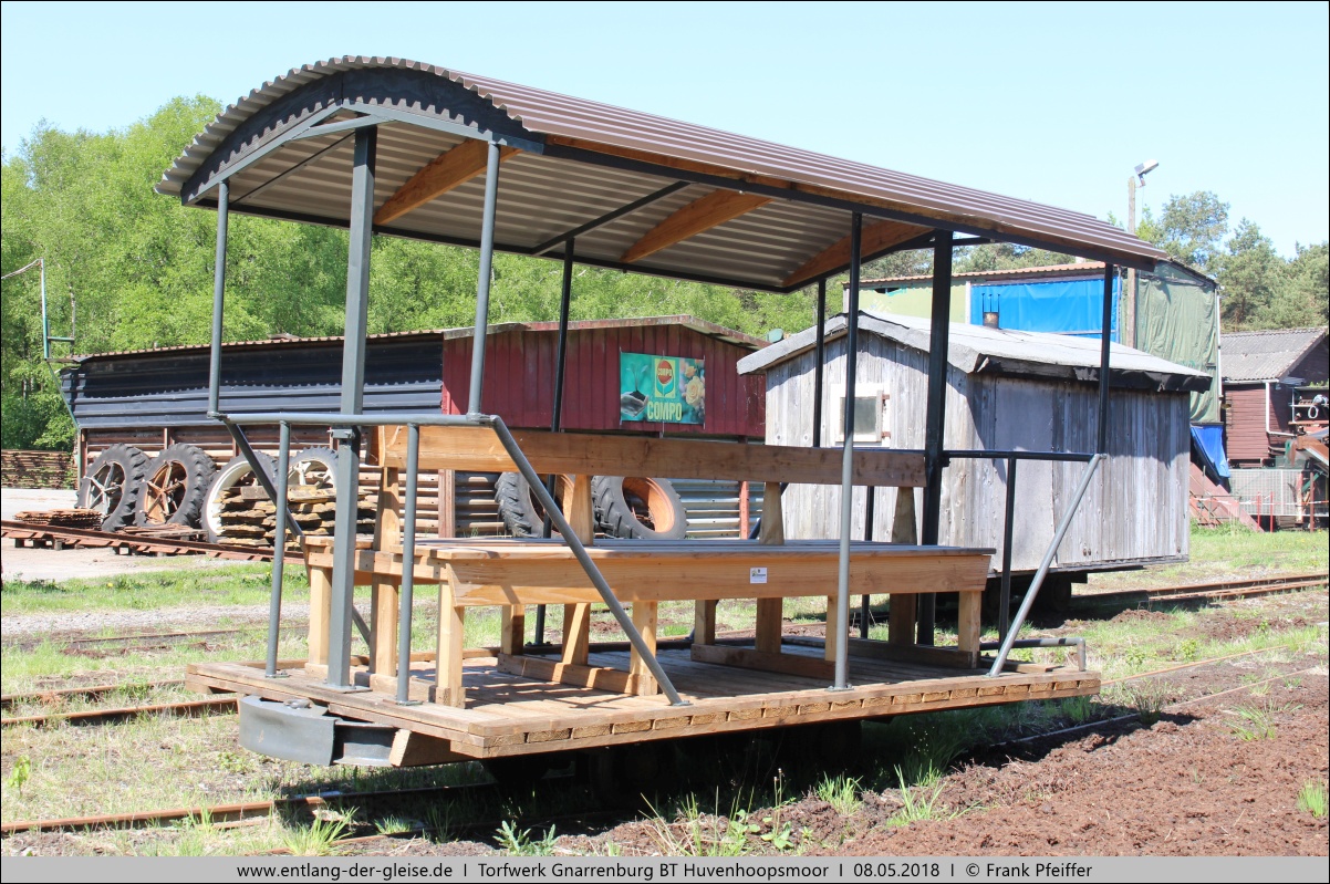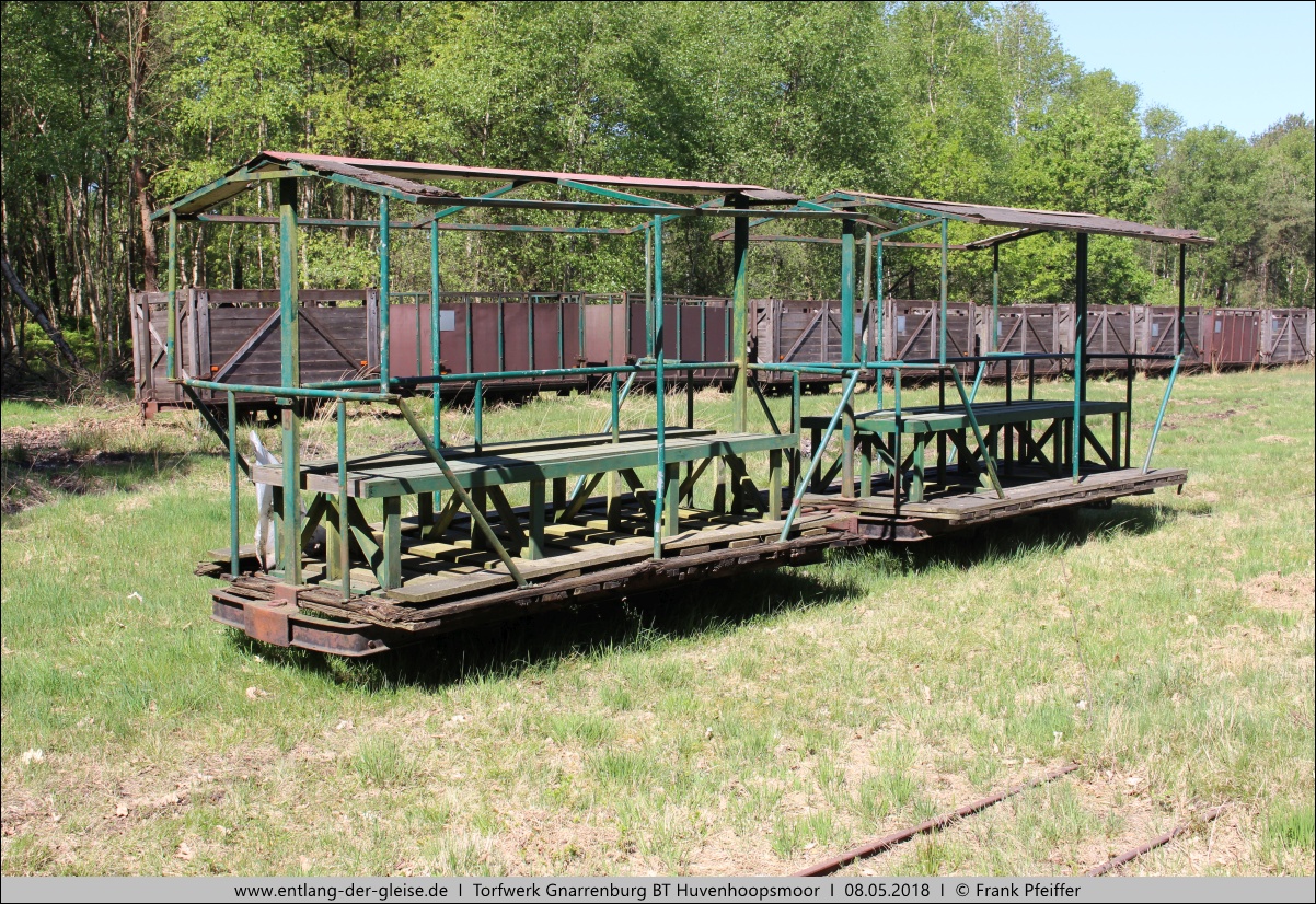 früher auch die Züge zum Hauptwerk in Gnarrenburg. 3.14 Offizielle Ausflugsfahrten wurden im Huvenhoopsmoor wohl niemals angeboten. Dennoch gibt es mehrere Personenloren. Hier zwei mit Schutzdach in leidlich gutem Zustand. Nur die Holzteile verrotten ziemlich. 3.15 Drei weitere Personenloren haben kein Dach und sind deutlich eingewachsen. Sie wurden sicher schon seit Jahren nicht mehr genutzt. |