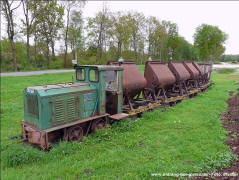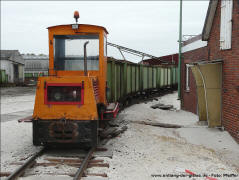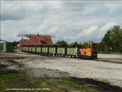 1 Die modernste Lok im Bestand war im Mai 2012 Schöma 6116/2006, eine CHL-40G mit der Betriebsnummer 1. Hier schiebt sie am 09.05.2012 einen beladenen Zug ins Werk. Ganz links erkennt man 900 mm Gleisreste, die schon wieder stillgelegt wurden und nur im Bereich des Bahnüberganges noch erhalten geblieben sind. |