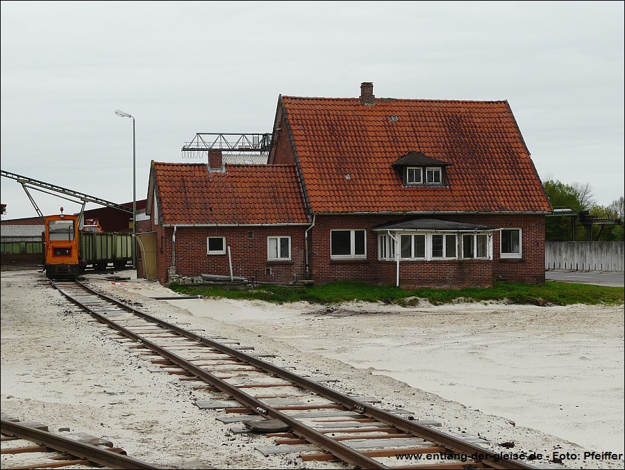 Denkmal. 3 Vom alten Torfwerk Sevin blieb das Verwaltungsgebäude erhalten. Links daneben liegt das Gleis zur Waggonentladung. Rechts erkennt man noch den Küstenkanal. 4 Ein Blick in Richtung der Entladeanlage. Die Gleisanlagen im Werk sind seit der Umspurung einfach gehalten. |