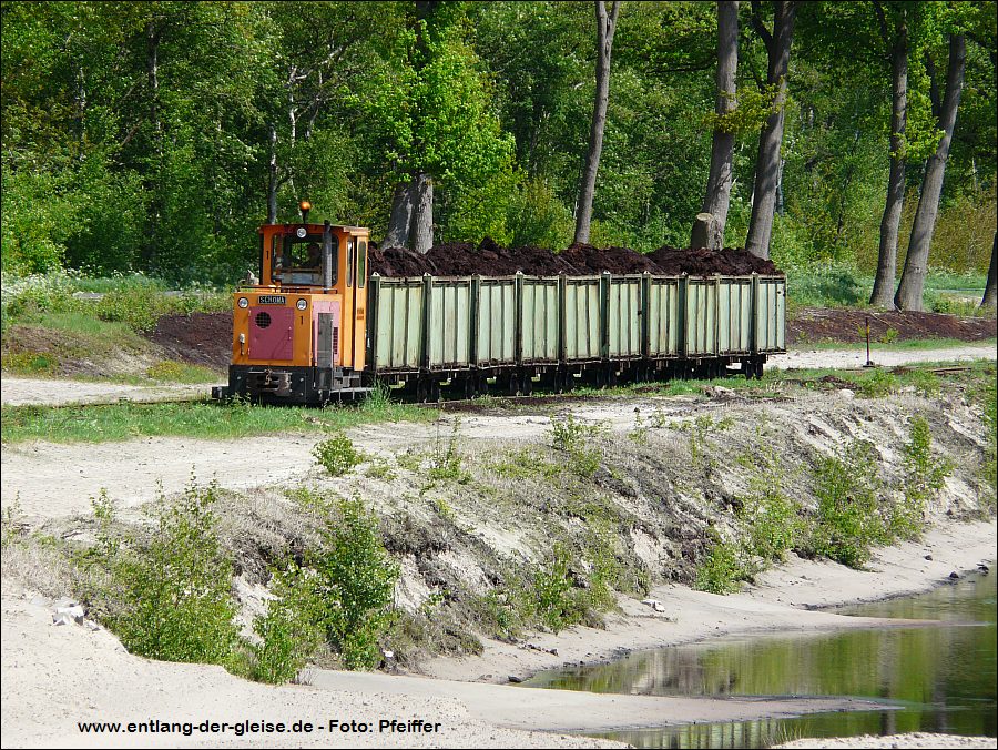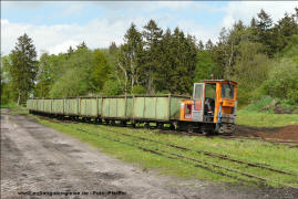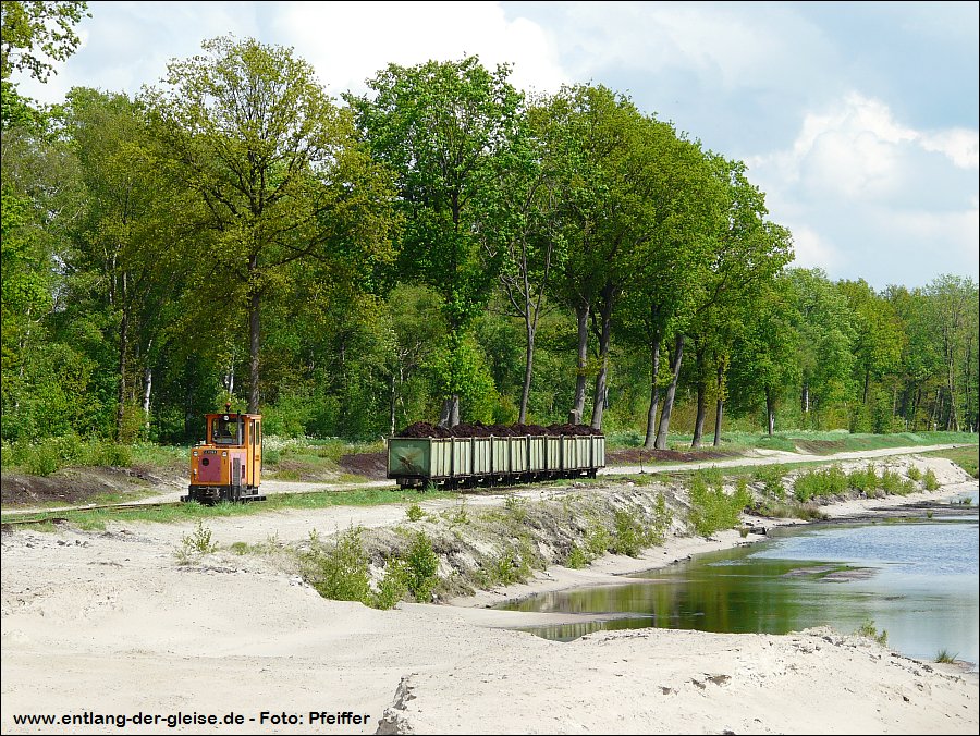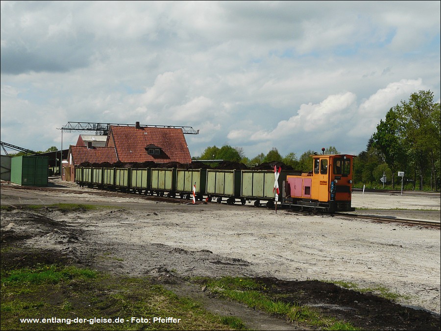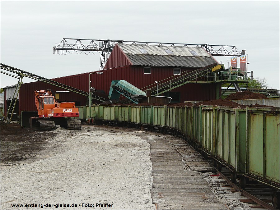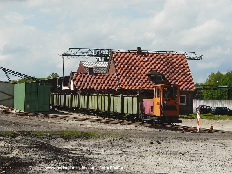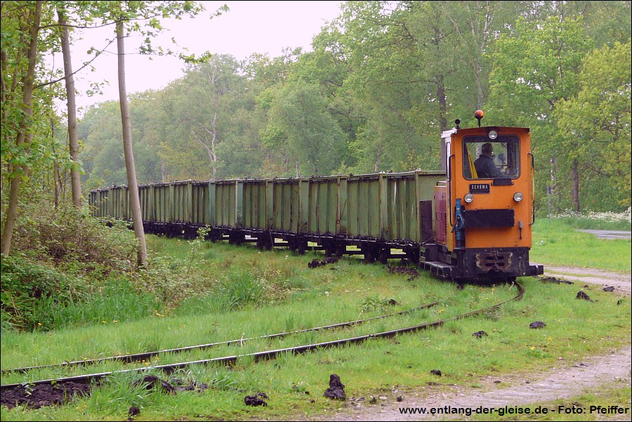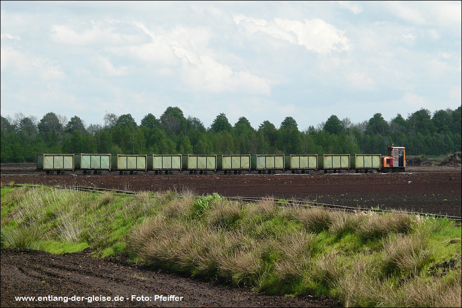 und auch eine Gleisverbindung. Der Lokomotivbestand besteht ausschließlich aus Schöma-Modellen und ist dennoch sehr abwechslungsreich. Er beinhaltet auch modernisierte oder in Eigenregie stark umgebaut Maschinen. Da sich viele Loks im nicht zugänglichen Moor befinden und auch am Wochenende nicht ins Werk fahren, bekommt man bei Besuchen nur einen Teil zu Gesicht. Am Werk selbst sowie auf der Verbindungsstrecke zum Vehnemoor kann der Feldbahnbetrieb von öffentlichen Flächen aus gut beobachtet werden. Der vorwiegend nasse Torf dient hauptsächlich zur Champignongzucht in den Niederlanden und wird auch per Schiff dorthin transportiert. Dafür verfügt das Werk über eine eigene Verladestelle am Küstenkanal. Hinweise: Die Bilder 2 bis 19 können durch Anklicken vergrößert werden. |
