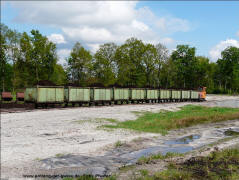 11 12 13 Endlich Betrieb! Am 09.05.2012 erreicht Lok 1 mit einem beladenen Zug aus dem Vehnemoor die Ausweiche vor dem Werk. Dort wird abgekuppelt und der Zug umfahren, um ihn anschließend die restlichen Meter ins Werk zu schieben. Hinter der Baumreihe im Hintergrund verbirgt sich der Küstenkanal. |
