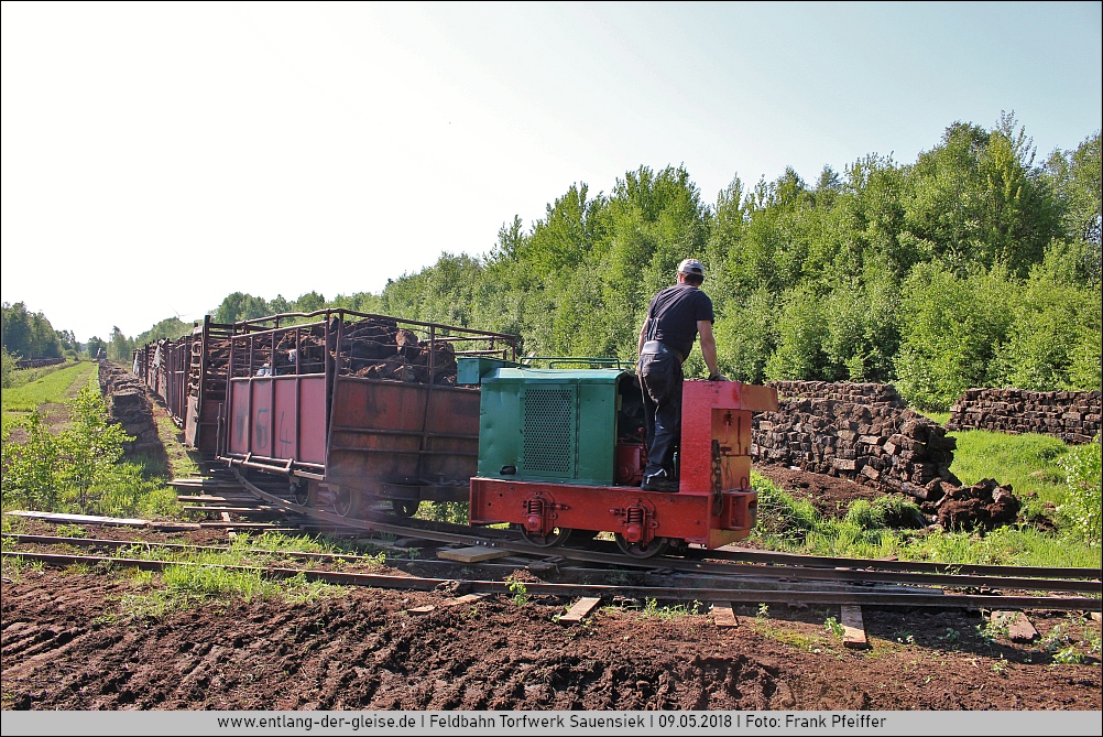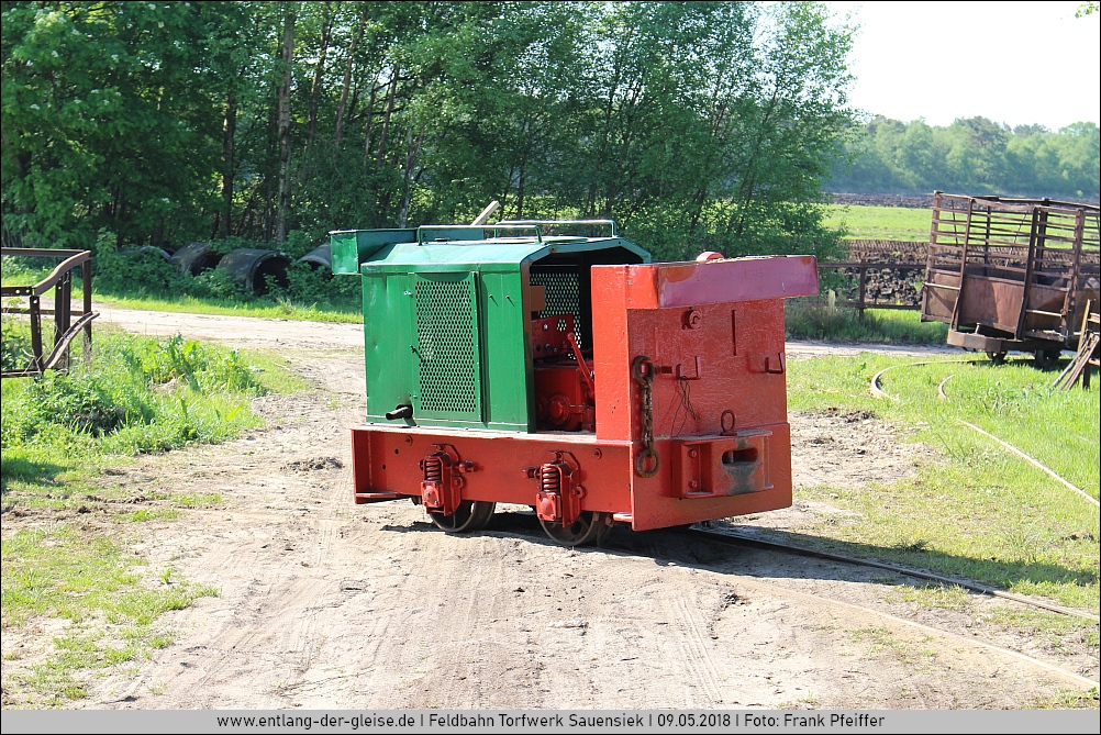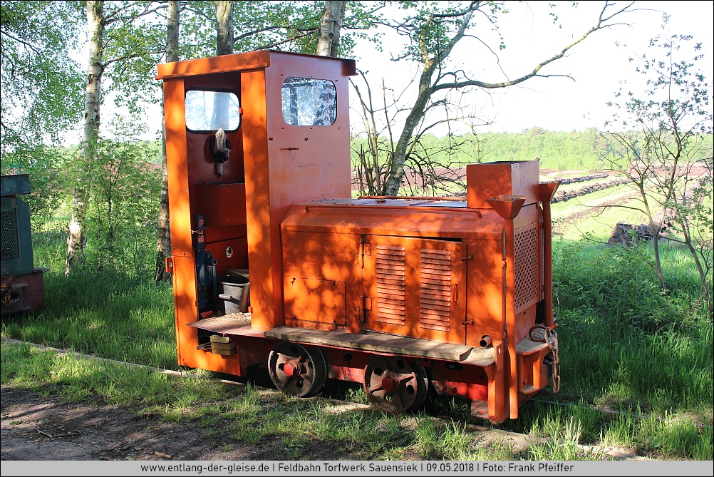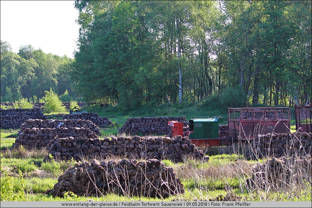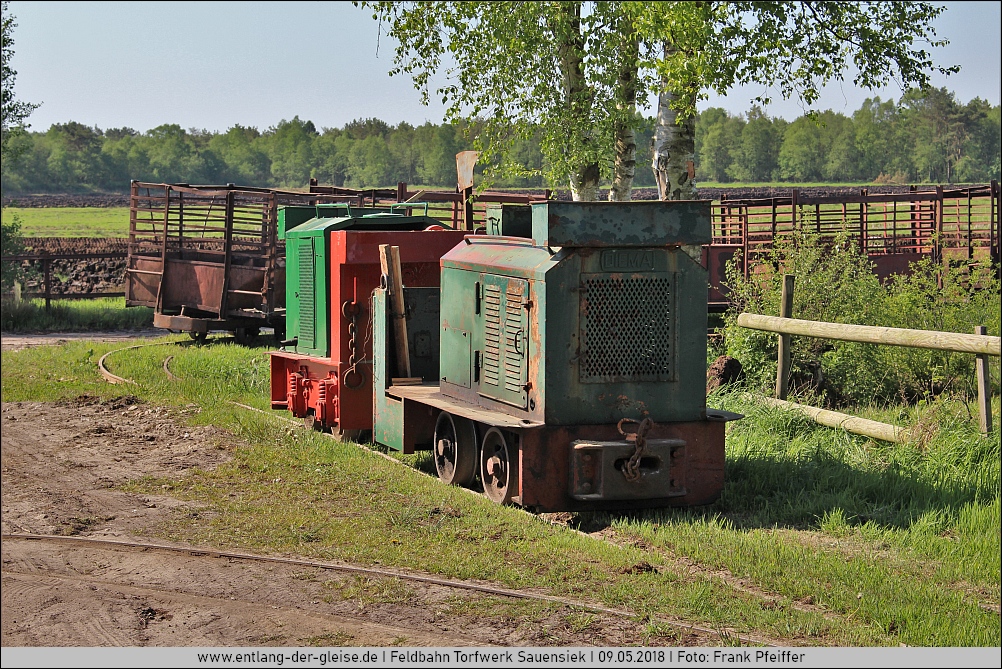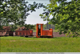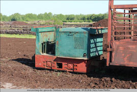 Treckergespann, den Atlas 134 LC und die Schöma 2376/1960. 1.2 Zwischen Torfsoden und viel Grün versteckt sich Diema 2521/1962, die als Moorlok eingesetzt wird. 1.3 An dieser Stelle gibt es eine befestigte Ladestelle, wo Torf von einer Miete in Züge oder Treckergespanne umgeladen werden kann. Schöma 2376/1960 vom Typ KDL 6 ist mit einer Garnitur leerer Loren abgestellt. |