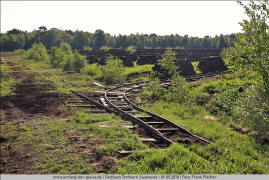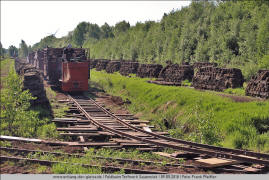 1.4 Nochmal ein Blick auf einen Teil der Abbauflächen. 1.5 Eine Backers Torfstechmaschine wartet ebenso auf die Rückkehr des Personals, wie die Profilierungsfräse im Hintergrund. 1.6 Über einen provisorischen Abzweig wurde hier ein fliegendes Gleis ans Netz angeschlossen. Es wird nur genutzt, bis die Torfsoden hier abtransportiert sind und dann wieder entfernt. |