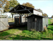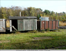 Gnarrenburg typischen fahrbaren Aufenthaltsbuden. 1.11 Auch diese Lore mit Ofenrohr war wohl für das Personal gedacht. Auf Fenster hatte man bei ihr aber weitgehend verzichtet. 1.12 Zum Abstellen der Lokomotiven waren mehrere Fertiggaragen aufgestellt. In einer davon war Lok 15 (Diema 1524/1952, DL 8) abgestellt. |
