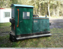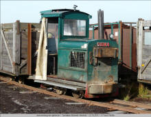 Schöma 6097/2006 (CHL 20G) an. 1.23 Damals wurde mit einer Lok gefahren. Später war der Zug in der Regel mit zwei Maschinen bespannt. Schöma 6097/2006 hat den Übergabebahnhof gleich erreicht. 1.24 Der Lokwechsel ist vollzogen. Die alte Diema 990/1939 (DS 12) mit der Betriebsnummer 5 übernahm als Moorlok die letzten Meter bis zur Ladestelle. |