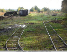 war Zeit, in Richtung des ehemaligen Torfwerks zu laufen. 1.8 Das Gelände wies noch fünf mehr oder weniger gut erhaltene Gleise auf, wobei das Streckengleis ganz rechts verlief. 1.9 In der Gegenrichtung bot sich dieser Blick auf die Anlagen. Einige nicht benötigte Loren waren abgestellt, außerdem zwei Traktoren. |