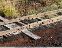 Traktoren bestimmt. 1.20 Typisch Feldbahn! Mehrere unterschiedlich starke Schienenstücke bilden schlussendlich eine befahrbare Strecke. 1.21 Auch wenn die Sonne schien, war es im Moor richtig nass und man sollte zu Fuß nicht auf die Idee kommen, abseits des Bahndamms zu laufen. Zu sehen ist das Gleis vom Übergabebahnhof zu den Abbau- und Ladestellen. |