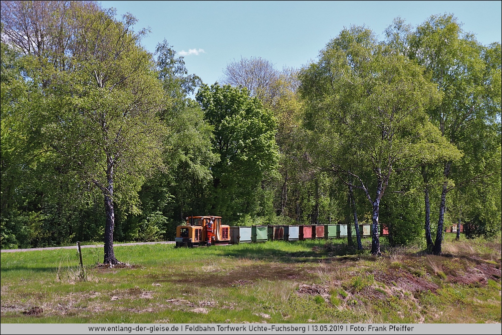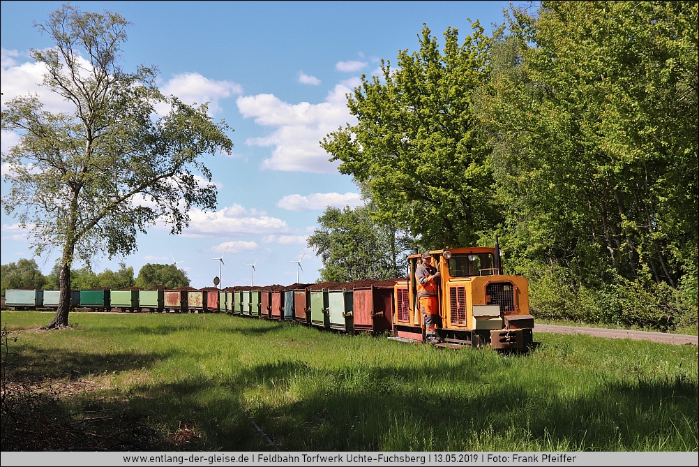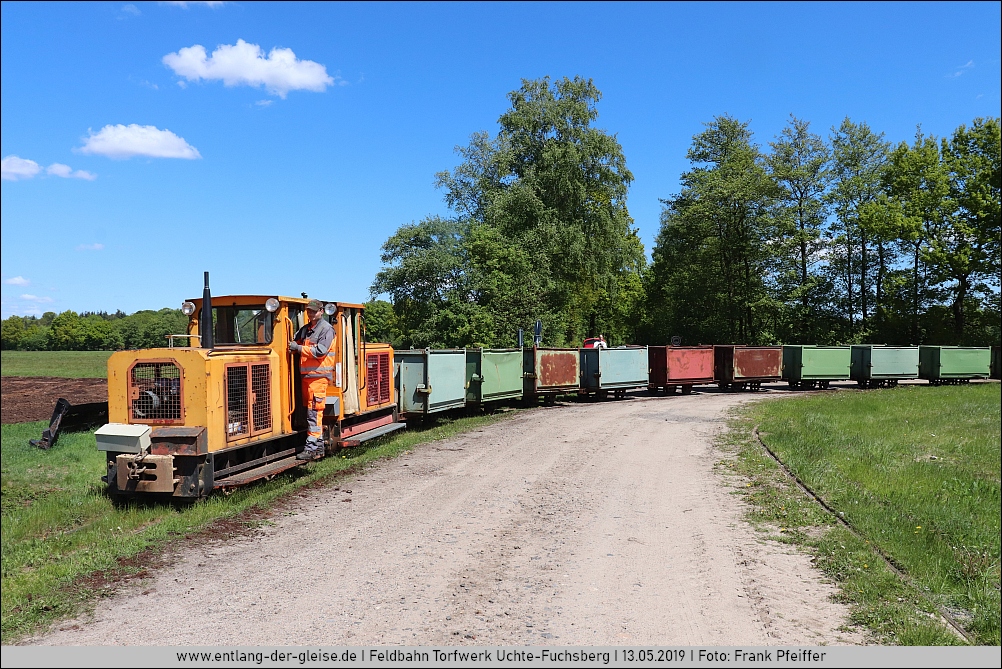 | Im Frühjahr 2019 wurde der Feldbahn in Uchte-Fuchsberg ein weiterer Besuch abgestattet und es entstanden wieder einige Bilder rund um die 90 Grad Kurve in der Nähe des Werks. |