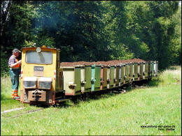 des Moores. 3.2 Der Zug mit den beiden Schöma CHL 20G biegt nun nach links ab, während die Straße nach rechts zwischen den Bäumen verschwindet. 3.3 Es führt die Schöma 4798/1985 mit der Betriebsnummer 3. Rechts neben dem Feldweg liegen einige Abstellgleise, die nur selten genutzt werden. |