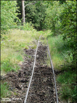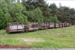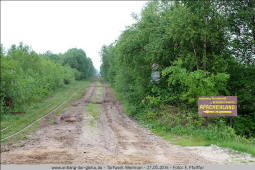 dem Zug entgegenfahren. 2.5 Interessant ist die Beschilderung dieses Damms im Moor: "Abzeig Bonnhorst, Schröers Damm" und vor allem der Hinweis auf das "Apachenland" verleiten zum Schmunzeln. 2.6 Hier fährt dagegen nichts mehr. Die letzten hundert Meter Gleis auf "Schröers Damm" sollten ohne vorherige Kontrolle nicht mehr befahren werden. |