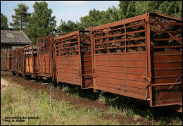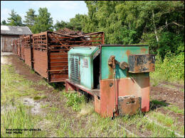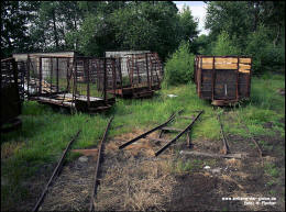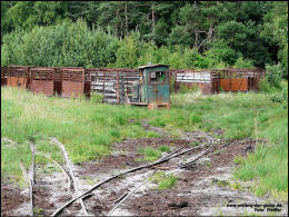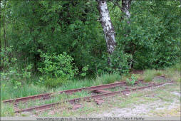 Zum Abschluss noch drei Bilder ohne Lokomotiven. 2.19 Vom Hauptdamm, dessen Gleis streckenweise von den Zügen der Torfwerke Warmsen und Uchte gemeinsam benutzt wird, zweigen Nebengleise ab. 2.20 Hier fährt nichts. Geradeaus schon lange nicht mehr und rechts abbiegend auch schon seit einiger Zeit nicht. 2.21 Abgestellte Loren mit Holzvebretterung stehen teilweise auf, teilweise neben den Schienen in dem großen Bahnhof, der dem eigentlichen Torfwerk vorgelagert ist. Im Betrieb werden mittlerweile fast ausschließlich Loren mit kompletten Metallaufbau eingesetzt. |