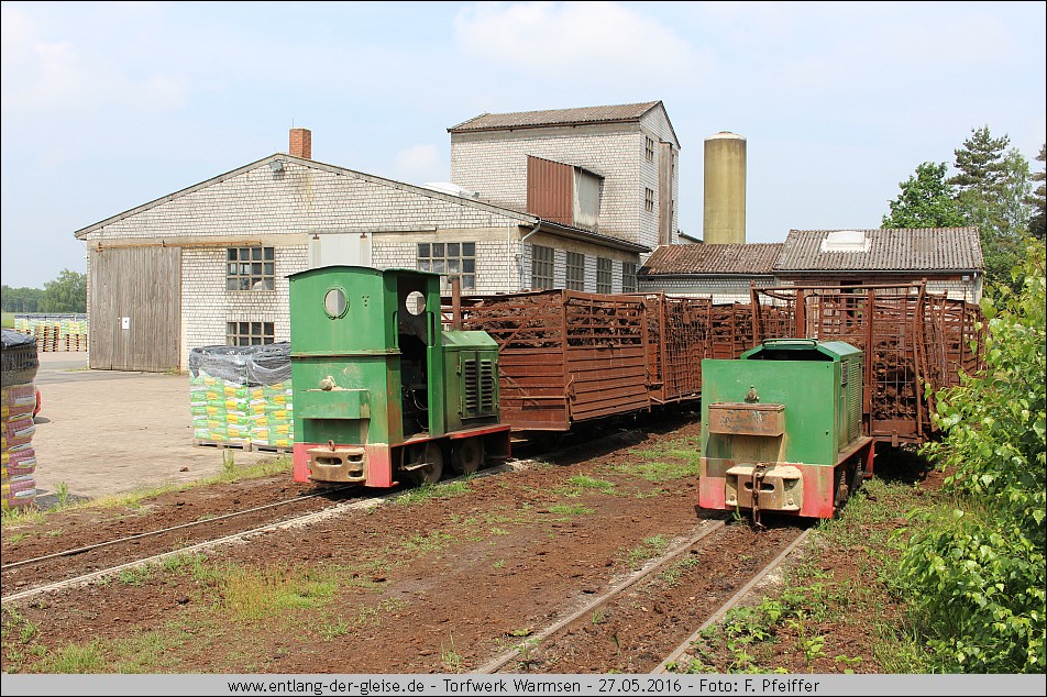 Zeit aufkommen. Abgebaut wird der Torf im Uchter Moor, die Gleisanlagen in 600 mm Spurweite sind im Moor mit den Anlagen des Torf- und Humuswerks Uchte verbunden. Der gewonnene Torf - meistens Stechtorf - wird direkt im Werk weiterverarbeitet und in Säcke für den Endverbraucher abgefüllt. Den Streckenbetrieb besorgen drei bis vier Lokomotiven, die die sehr langen Züge gemeinsam befördern. Zwei Loks rangieren unmittelbar an der Entladung und ein bis zwei weitere Loks werden - jedenfalls 2016 - auf den sehr weitläufigen Gleisanlagen vor dem Werk zum Rangieren genutzt. Hier befindet sich seit einiger Zeit noch eine weitere Entladung unter einem einfachen Wetterschutzdach. Hinweise: Das Betriebsgelände wurde erst nach Anmeldung durch den Betriebsleiter betreten. Die Bilder lassen sich durch Anklicken vergrößern. |
