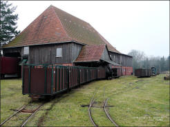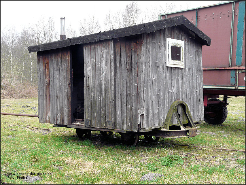21 Schöma 6096 hat im Moor die alte Diema 1233 mit ihrem Zug eingeholt und kuppelt am hinteren Zugende an. Gemeinsam geht es weiter zur Beladestelle. 22 Gemütlich ist anders: Die fahrbare Aufenthaltsbude war im Torfwerk abgestellt. |
