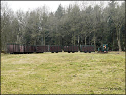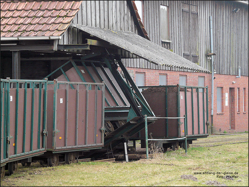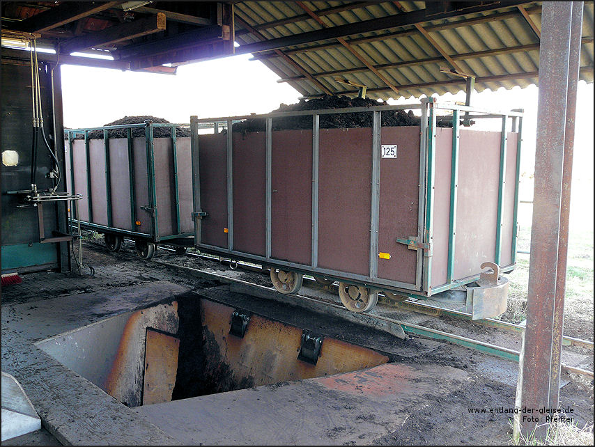 | 2 3 4 Hier werden die Loren entladen. Lok 40, hinter der sich die Diema 1268 von 1948 verbirgt, schiebt die Wagen Stück für Stück auf die Kippanlage. Dort werden sie entkuppelt, arretiert und von einem Hydraulikstempel gekippt. Anschließend werden sie wieder gekuppelt und stehen für die nächste Fahrt ins Moor bereit. |